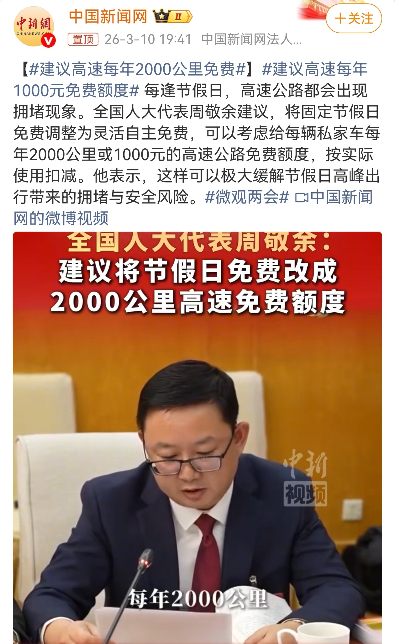 两会期间,全国人大代表周敬余建议,将固定节假日免费调整为灵活自主免费,可以考虑给每辆私家车每年2000公里或1000元的高速公路免费额度,按实际使用扣减。在我看来,周敬余提出这一建议的初衷,是为了缓解节假日高峰出行情况,但没有考虑到打工人的节假日都是统一时间,即便高速免费额度,还是会拥堵。建议高速每年1000元免费额度两会观察团