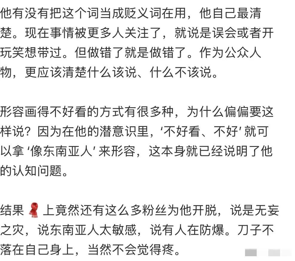 张凌赫在东南亚的舆论大翻车!发ins道歉了,但东南亚网友们很生气。 在综艺里张凌赫玩游戏时,面对田曦薇给他画的抽象肖像画,张凌赫说:“我感觉像出生在东南亚!” 这个片段目前被东南亚网友疯传,大家认为他的这番言论是地域歧视,外貌刻板印象,触碰了东南亚网友们的底线,他们觉得自己受到了冒犯。 ps:张凌赫在泰国越南都是有一定人气基础的。 随后,张凌赫在评论区发文说:“我绝对没有歧视的意思,多年来,东南亚粉丝给我的支持,我心怀感激。”但东南亚粉丝还是不依不饶,觉得他不是真心道歉。 倒也能理解他们生气的点,因为张凌赫这句话形容的是一幅画,画中的人物画的确实不好看。就和外国人画了一张眯眯眼,另外一个外国人说这画的像中国人一样,我们也会生气,现在东南亚人就是这种感受。 所以说明星确实要谨言慎行,这就是明星不容易的一面,随便说点什么都容易被放大被曲解,但毕竟吃哪碗饭就得承受哪个行业的规则,这也没什么好说的。 张凌赫完全没有歧视的意思,只是单纯说长相有点像,要平时他说这话估计无人在意,不过现在这部剧在东南亚那边挺火的所以关注的人多,我是看节目的时候真觉得没啥。