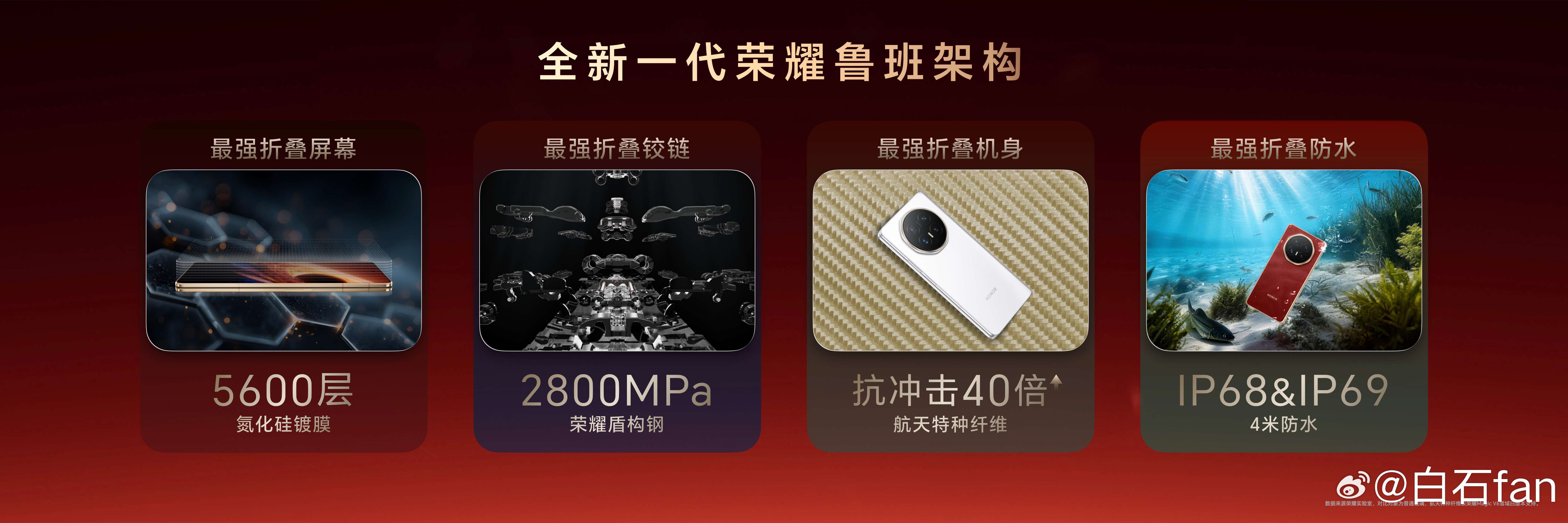 荣耀magicv6 这次主打两个字:可靠!荣耀MagicV6行业唯一4米防水,并通过IP68&69防水防尘认证,都是折叠屏最强配置。屏幕好,铰链强,机身硬,防水级别高!全新一代荣耀鲁班架构,有点意思