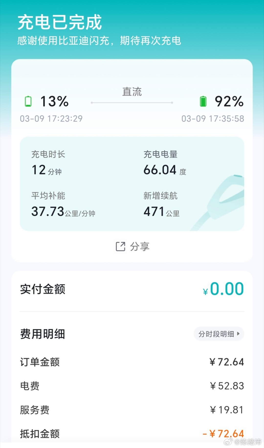 账单显示我充了66.04度电,确实打折了,损耗率竟然高达0.47%!