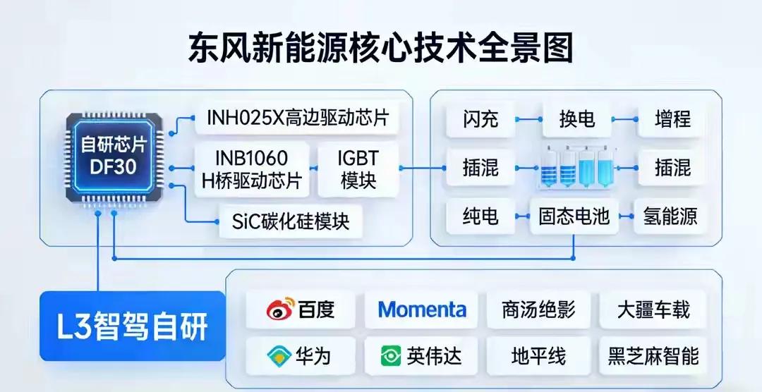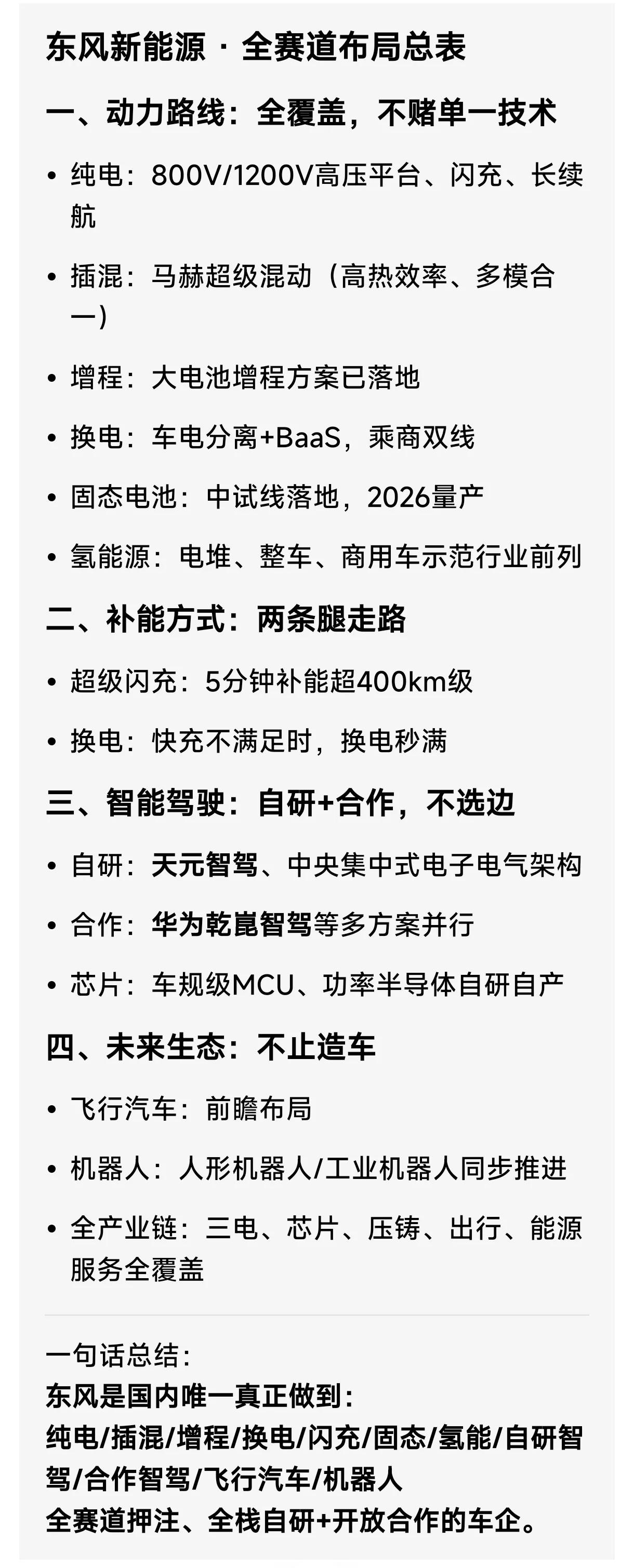 就是东风汽车集团,它是目前唯一全赛道押宝、不选边站、全覆盖的央企车企,你提到的所有方向它都有明确技术/产品落地与规划。 一、电动化全路线(全覆盖) - 纯电:量子架构、猛士M TECH、iD3十合一电驱;800V/1200V高压平台 - 插混/增程:马赫PHREV超级混动,热效率47%+,三模合一 - 闪充:1200V/1700V高压,5分钟≈450km - 换电:车电分离+BaaS,覆盖乘商用车 - 固态电池:中试线投产,2026年量产,续航1000km+ - 氢能源:400kW氢燃料电堆(重卡),商用车示范量行业第一,专利830+项 二、智能化全栈(自研+合作) - 自研芯片:车规级MCU(DF30)、IGBT,牵头芯片创新联合体 - 自研智驾:天元智驾、中央集中式SOA架构,L2+量产、L4示范 - 合作智驾:华为乾崑智驾等多方案并行 三、未来生态(全布局) - 飞行汽车:已布局相关技术与合作 - 机器人:人形机器人研发推进中 - 全产业链:三电、芯片、压铸、出行服务全覆盖 一句话总结:东风不赌单一技术,全栈自研+全场景覆盖,是真正的“全能型”新能源车企。 除了东风还有谁?全赛道押宝、不选边站、全覆盖”的标准(纯电/插混/增程/换电/闪充/固态/氢能+自研+合作智驾+飞行汽车+机器人),只有东风是100%全覆盖;其他车企最多算“多赛道”,达不到“全赛道”。