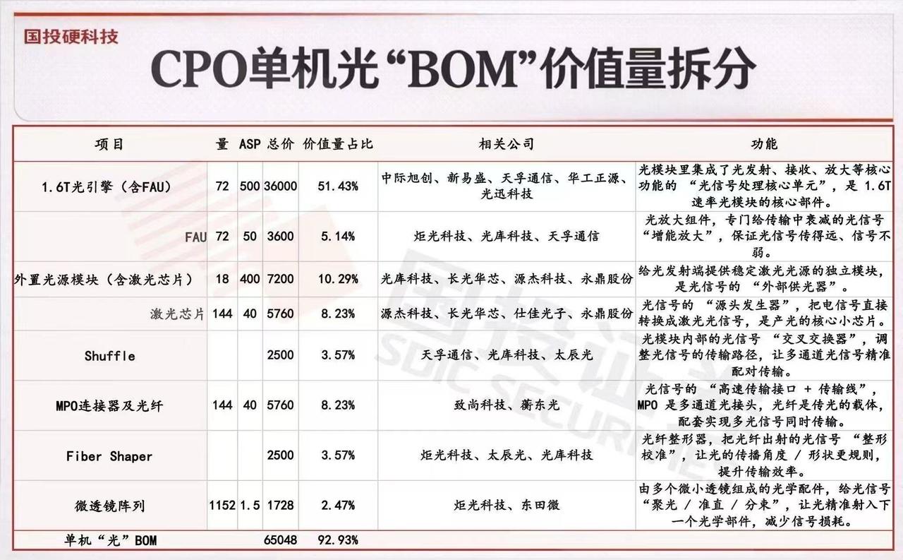 CPO单机光“BOM”价值量拆分