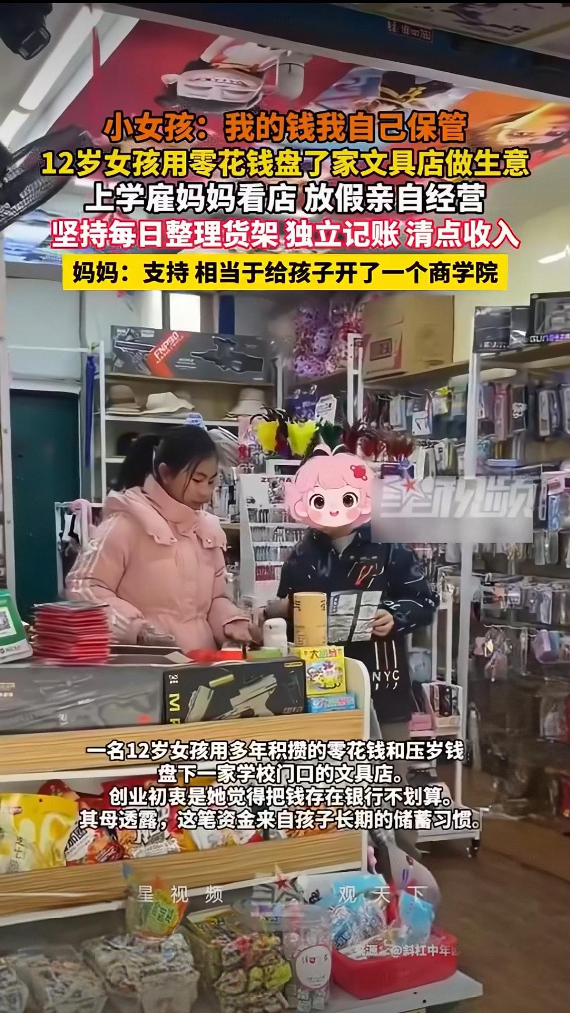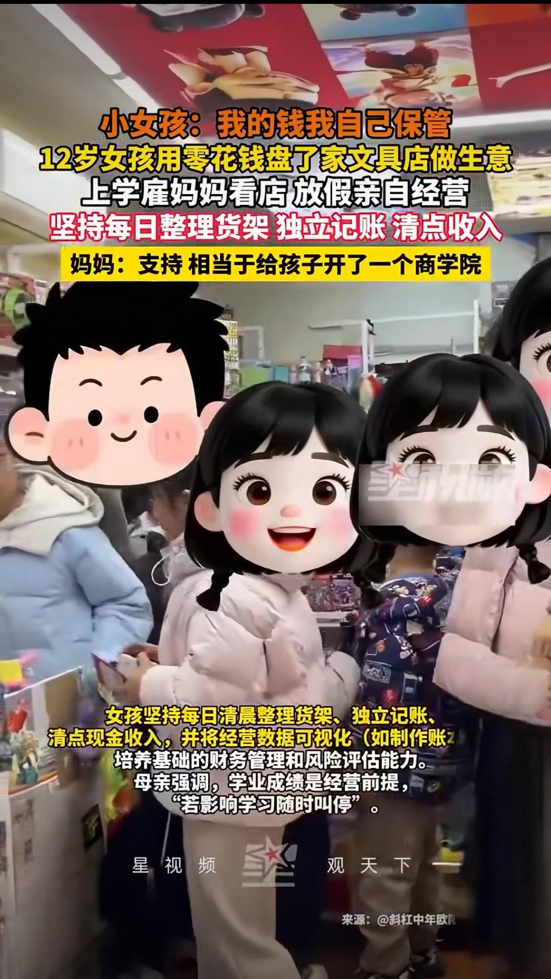 12岁女孩“盘下”文具店火了!自己出钱、雇妈看店,一句话戳中无数家长:这才是顶级富养 最近,一个12岁小女孩凭实力火遍全网,没有惊天才艺,没有刻意炒作,却靠一句“我的钱我自己保管”,让无数成年人自愧不如。 这个小姑娘,用自己多年攒下的零花钱,全款盘下了一家文具店。上学期间,她放心“雇佣”妈妈帮忙看店,一到放假,立刻变身小老板亲自坐镇,把生意打理得井井有条。 别人的12岁还在伸手要零花钱,她已经学会独立整理货架、仔细记账、每日清点收入,每一笔账都清清楚楚,每一件货品都摆放整齐,小小年纪,却有着远超同龄人的沉稳和规划。 面对孩子的选择,妈妈没有泼冷水,没有觉得“不务正业”,反而全力支持,笑着说:这就相当于给孩子开了一所现实版的商学院。 一句话,道出了最通透的教育观。 很多人羡慕孩子的独立懂事,更羡慕这份被尊重、被信任的成长环境。我们总教孩子好好学习,却很少教他们如何面对金钱、如何学会独立、如何为自己的选择负责。而这个女孩,在小小的文具店里,早早读懂了责任、付出与收获的意义。 她不是在“过家家”,而是在真实的生活里,悄悄长成了最有底气的模样。 有人说,这孩子未来一定差不了;也有人说,比起成绩,这份独立和担当才是一生的财富。 看完这个小老板,你有什么想说的?你支持孩子从小接触生意、学习理财吗?评论区聊聊你的看法。湖南12岁女孩