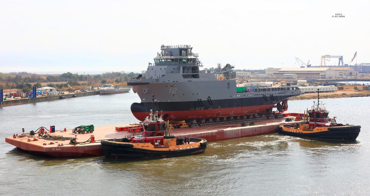 美Austal USA船厂下水第三艘新一代Navajo级应急救援拖船。 新拖船的总长为80米,排水量达5000吨,可额外装载2000吨货物。 美国海军计划总共装备10艘此类拖船。