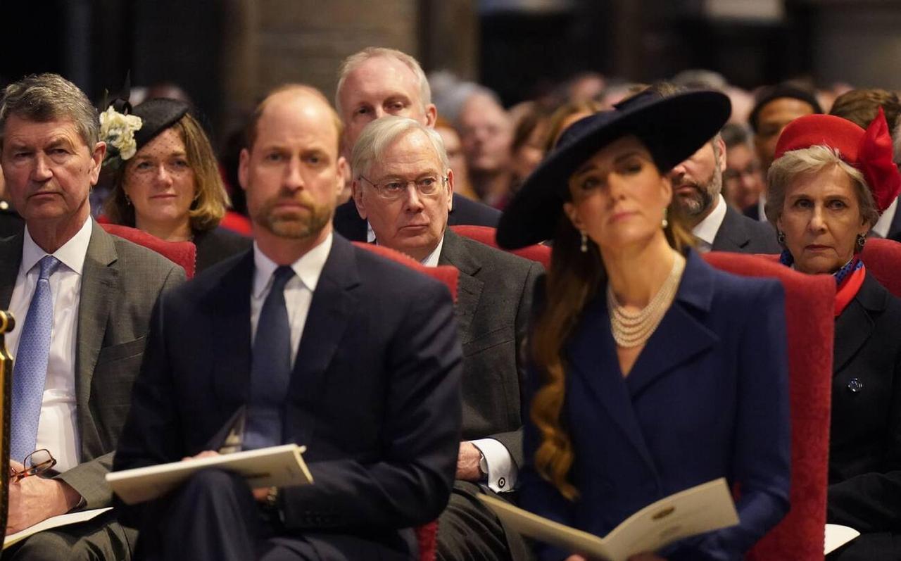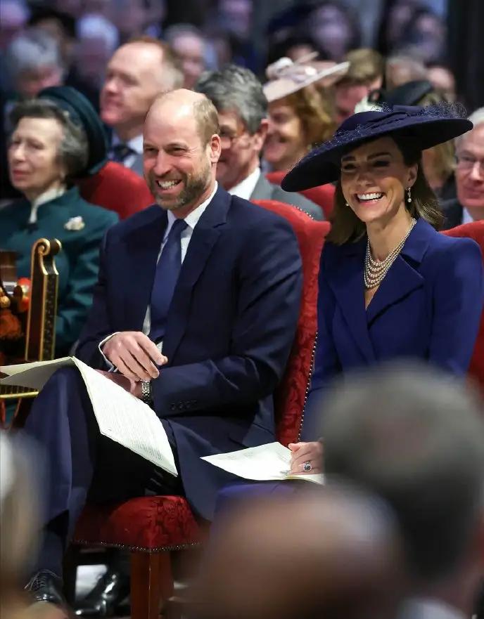 威廉凯特甜蜜合影! 威廉王子和凯特王妃每一次合体营业,总是会给大家带来甜蜜的画面。 当地时间3月9日,威尔士亲王夫妇陪同王室家人们一同在伦敦的威斯敏斯特大教堂参加一年一度的联邦日活动。 威廉王子和妻子凯特王妃都选择了一身藏蓝色造型,威廉沉稳帅气,凯特优雅端庄,男帅女美,相当养眼。 夫妻俩携手同行,虽然没有任何亲密的举动,但是凯特搂着威廉的腰,两人时不时相视而笑。 尤其是笑起来的时候动作神态神同步,相当有夫妻相,细节之中尽显恩爱。