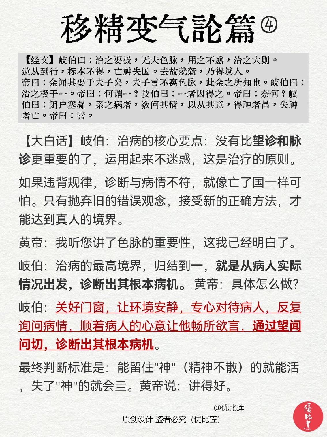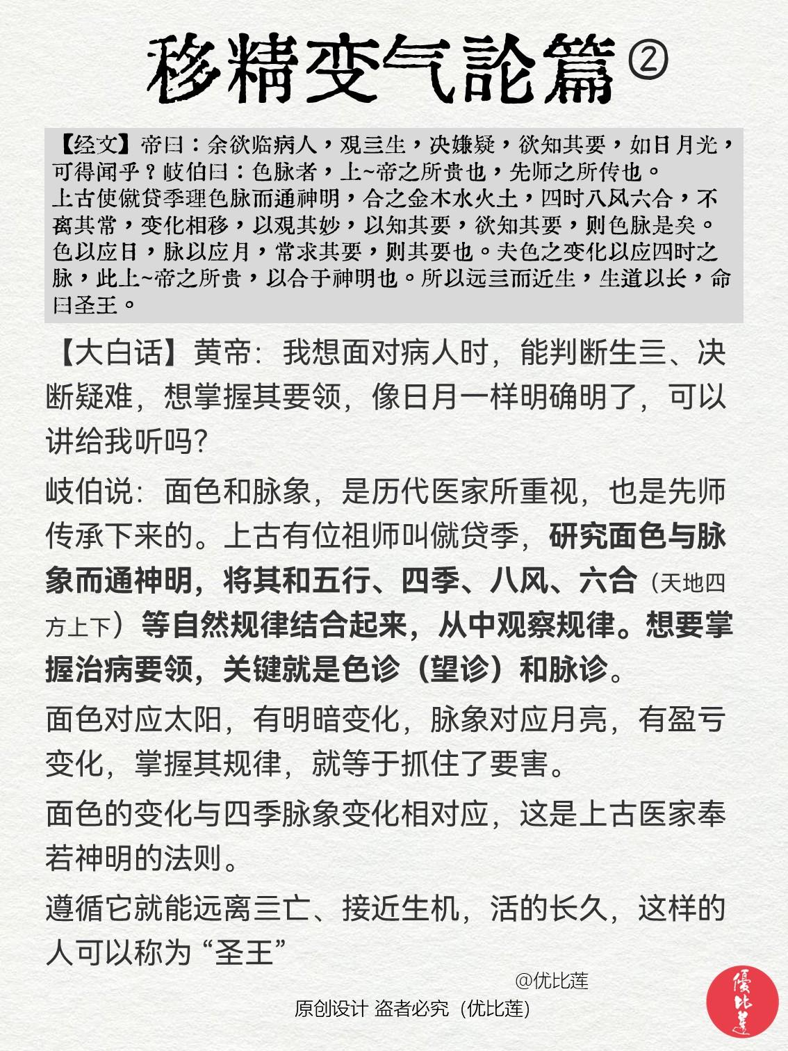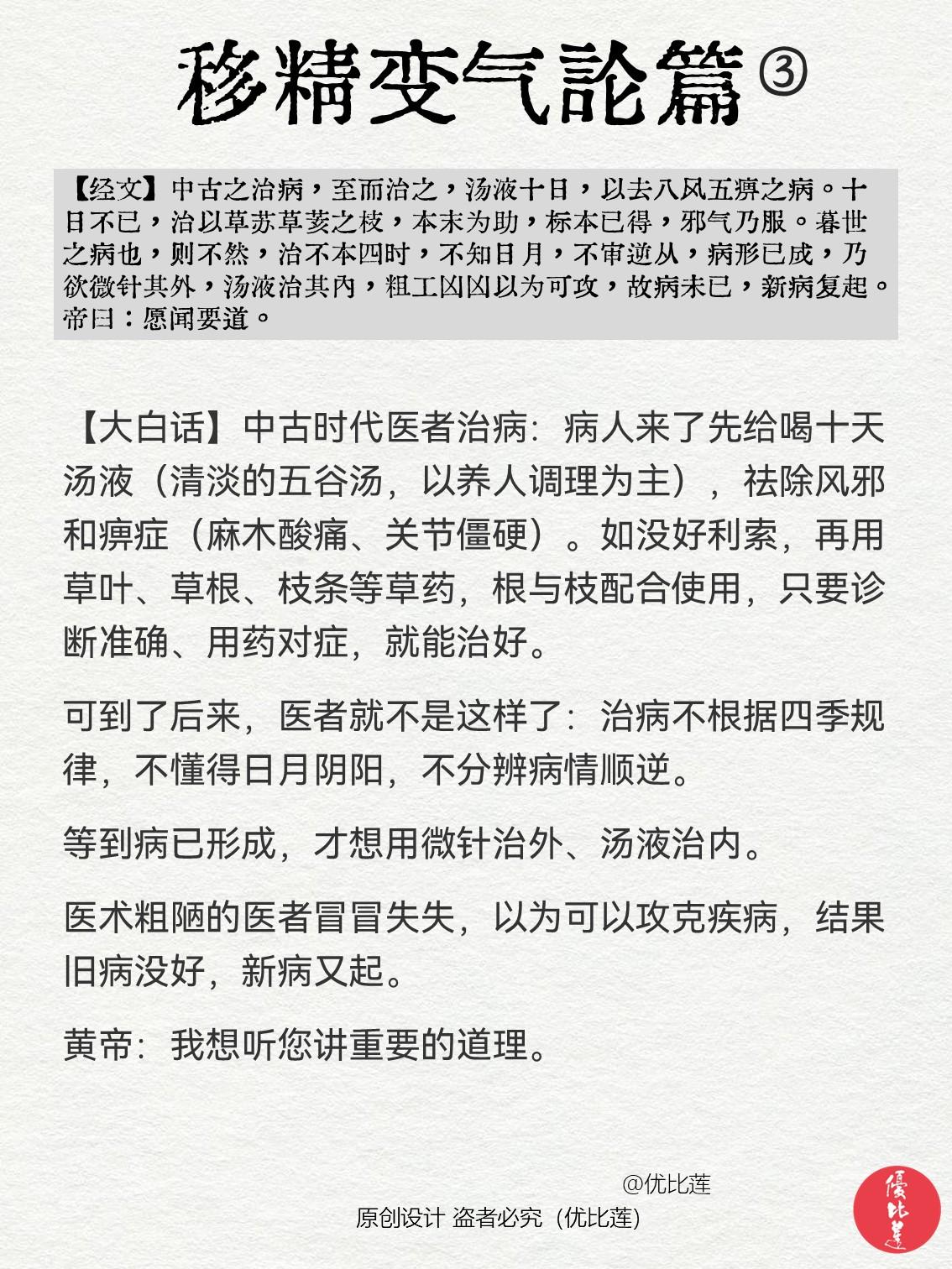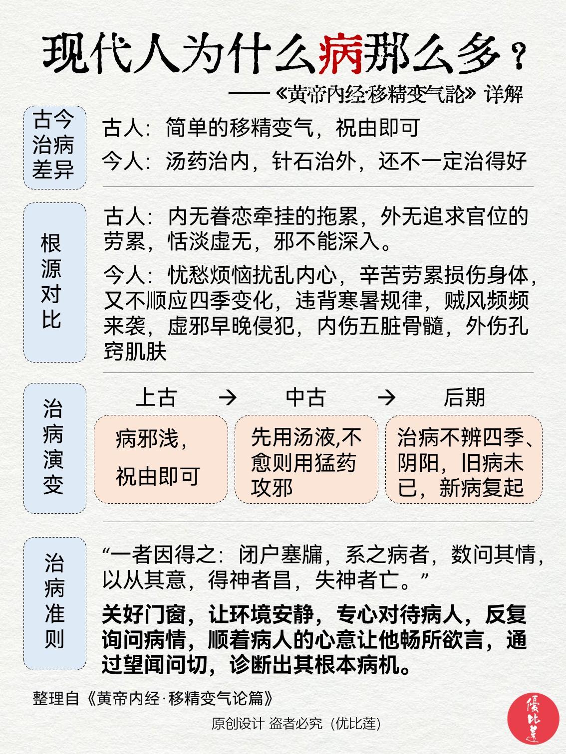 读懂《黄帝内经》现代人为什么病那么多? 笔记整理自《黄帝内经·移精变气论》 你是否也有过同样的疑问:现代人为什么病那么多呢? 可能会觉得是环境问题、饮食质量问题、生活习惯问题,或者是医学发展了,人类寿命长了,得病的概率自然也变大了…… 也有人些会说《黄帝内经》讲的是几千年前的情况,和现在的情况差别太大,没有参考意义? 当你读完后,或许你会发现,内经里讲的文字仍然适用于现代…… 黄帝内经