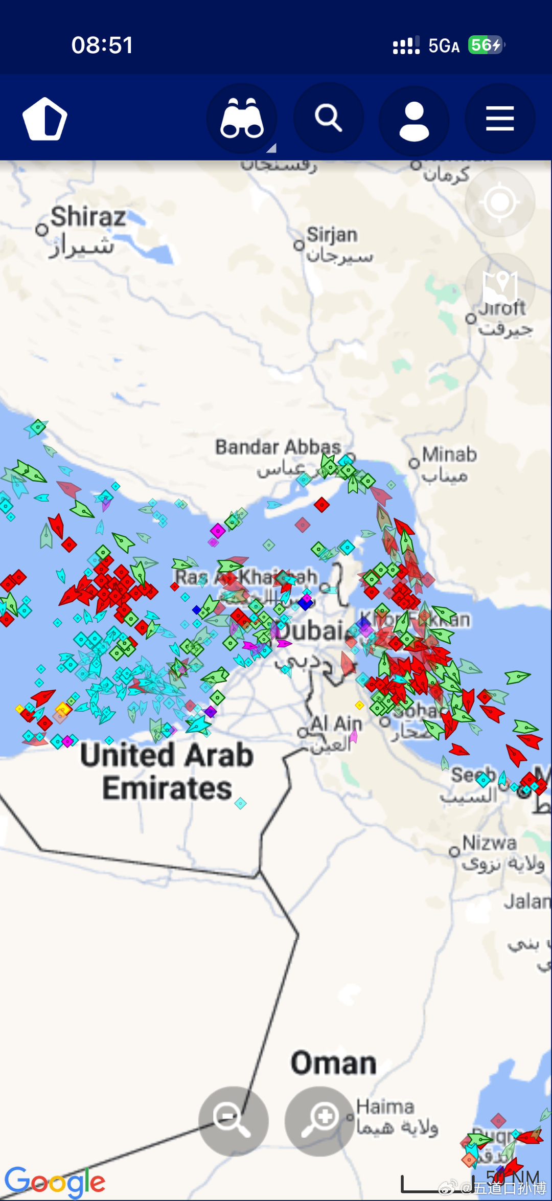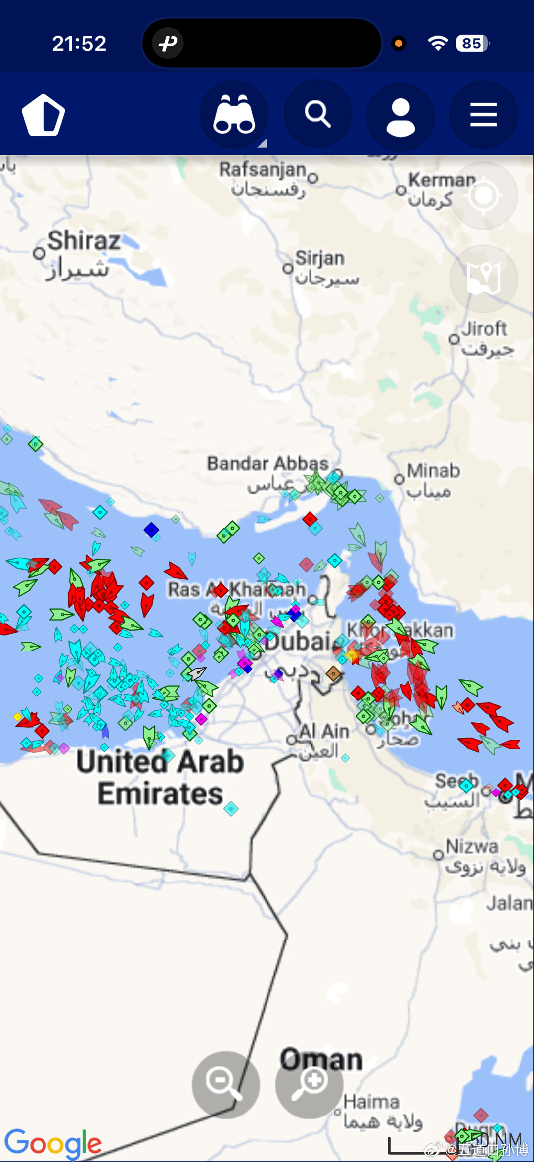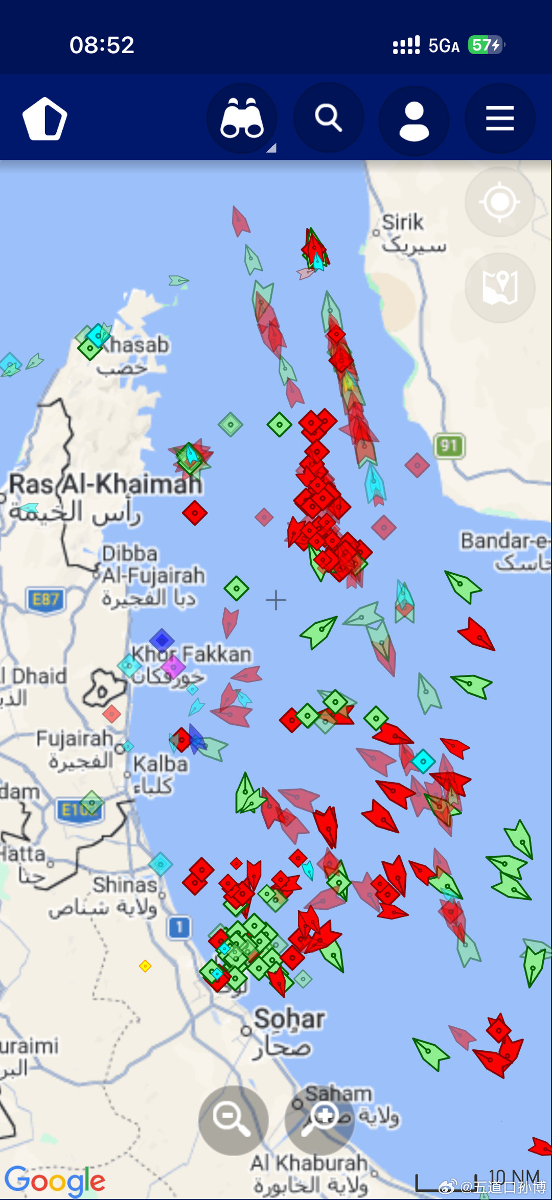 霍尔木兹海峡,昨天今天12个小时的拥堵情况的对比。