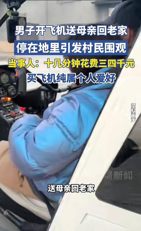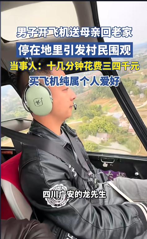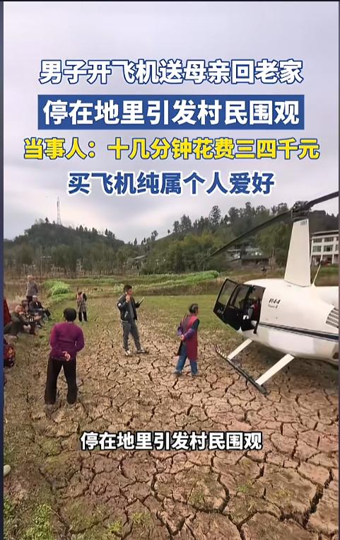 “开眼界了!”近日,四川广安,一男子在送母亲回老家时,因为车子没开出来,自己又恰好在机库,就驾驶自己的小型飞机将母亲送回了老家,全程只花费了十几分钟,到老家后,飞机停在空地上,引发了村民围观。网友:咱也算见过世面的人了! 私人飞机一直是身份与财力的象征,但随着经济发展,小型私人飞机的价格也变得“亲民”起来,不少有钱人都会选择尝尝鲜。随着国家鼓励低空经济,小型飞机进一步得到了推广,乡间地头都可能能遇见。 据媒体3月10日报道,事发当日,龙先生的母亲想要回老家,让他给送回去。可龙先生当时正在机库,并没有把车开出来,思索之下,便决定自己开着小飞机去送母亲。 龙先生的老家住在镇上,平时开车回去得一个半小时,这次只花了十几分钟就回去了,就是费用有点高,得三四千块钱。 飞到目的地后,龙先生把飞机停在地里,引来了一众村民的围观。一个个都想好奇宝宝,直呼开眼了! 龙先生说,他这架飞机买了也有两年了,只是一直没有开着回村过,他平时很喜欢户外运动,买飞机纯粹是个人兴趣。 网友看后表示,虽然现在小飞机便宜了,但自己还是买不起。祝愿自己能够多多赚钱,以后也能开上私人小飞机。就是自己近视,还得赚钱再雇个机长! 信息来源:《男子开飞机送母亲回老家,停在地里引发村民围观,当事人:十几分钟花费三四千元,买飞机纯属个人爱好》潮新闻