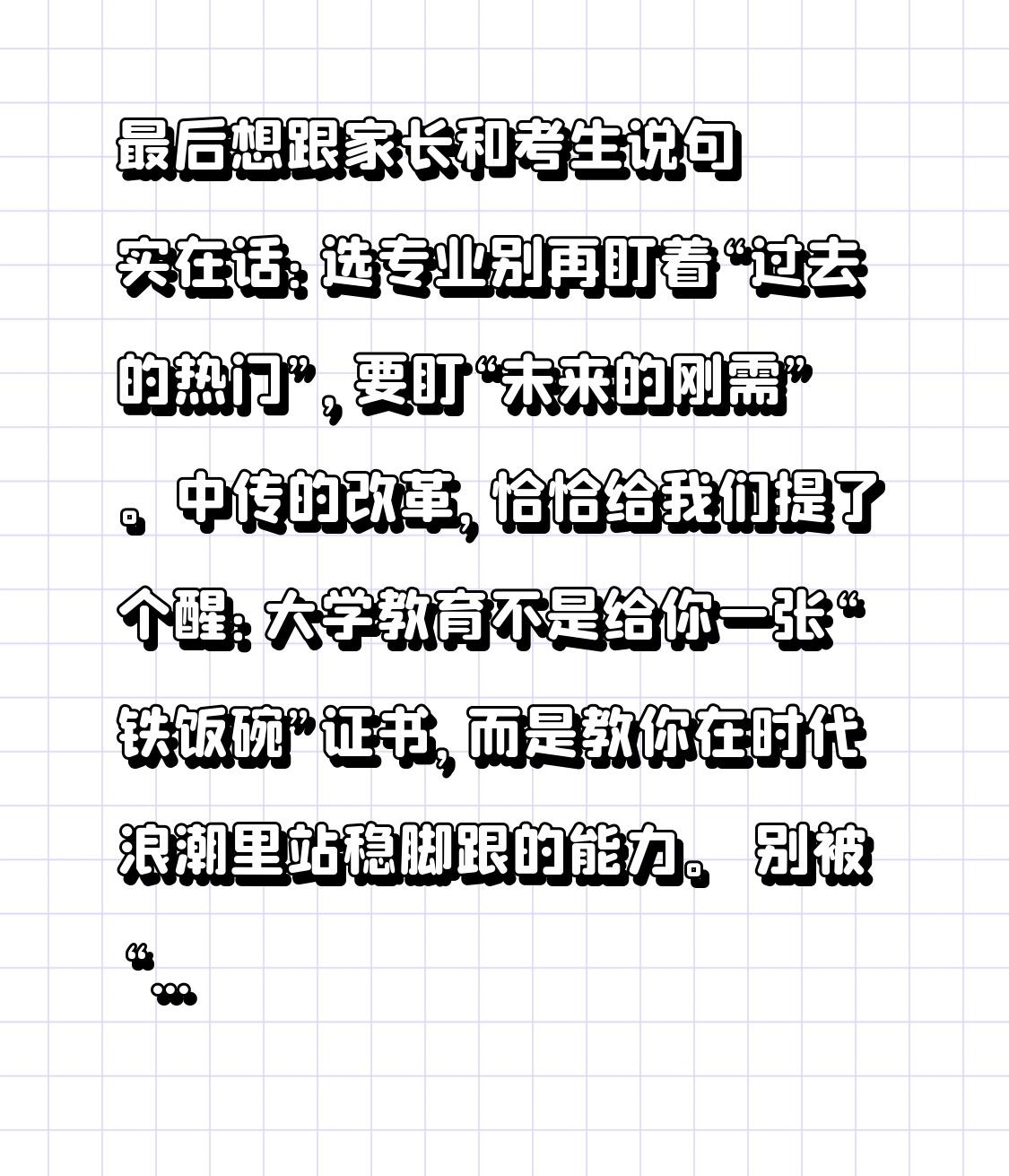 中传砍掉16个专业炸翻全网!书记紧急回应:别慌,真相让人破防了 炸锅了!中国传媒大学一口气“砍掉”16个本科专业,翻译、摄影、漫画这些曾被疯抢的热门专业全在名单里,瞬间冲上热搜!家长和考生慌了:名校也保不住专业了?以后还能报啥?就在全网疯狂焦虑时,中传党委书记廖祥忠亲自下场,甩出一句“不必惊慌”,直接揭开这场高校改革的惊天秘密! 大家最担心的“砍掉”,根本不是一刀切劝退!这场调整压根不是突然拍脑袋,而是中传从2018年就开始推进的“四个一批”长期改革——关停并转一批、升级改造一批、重点建设一批、规划设计一批,只不过去年力度大,才引发了这么大关注。 转折点来了!你以为是“减法”,其实是更精准的“重构”!所谓的“砍掉”,是把那些AI时代容易被替代的、纯技术训练类的细分专业整合升级,不是让学生没学上,而是让大家学更值钱的本事! 具体怎么调?给大家划重点: ✅ 不是取消,是“并”:摄影并入影视摄影与制作,漫画转为动画专业方向,视觉传达设计并入广告学,把零散技能打包成更系统的核心能力,避免只练重复劳动。 ✅ 不是淘汰,是“升”:2018到2025年,中传反而新增了20个专业,智能影像艺术、智能视听工程、游戏艺术设计这些“传媒+AI”的新专业全上线,集中资源做强未来赛道。 ✅ 不影响在读生:不管是已经学这些专业的,还是2026级新生,都按原方案培养,正常毕业拿证,学校全程兜底,不会让任何人“断档”。 为什么非要改?因为AI真的颠覆了传媒行业!以前学摄影要练半年技术,现在AI一键出图;以前做翻译靠堆词汇量,现在机器秒翻。如果还死守这些纯技术专业,学生毕业就可能被淘汰。中传是在帮大家提前抢滩,把重复性的活儿交给AI,专注练创意、思维、内容洞察这些AI做不到的核心能力。 更关键的是,这不是中传一家的动作,是所有顶尖高校的必然选择!高校专业设置必须和产业需求同频共振,就像工厂升级设备,不迭代就会被淘汰。那些觉得“专业没了”的,本质是学校在帮大家跳出内卷,去抢更有竞争力的位置。 最后想跟家长和考生说句实在话:选专业别再盯着“过去的热门”,要盯“未来的刚需”。中传的改革,恰恰给我们提了个醒:大学教育不是给你一张“铁饭碗”证书,而是教你在时代浪潮里站稳脚跟的能力。 别被“砍掉”两个字吓住,看懂背后的升级逻辑,你才能抓住真正的机会! 你会支持这种专业调整吗?评论区聊聊,帮更多人看清真相!