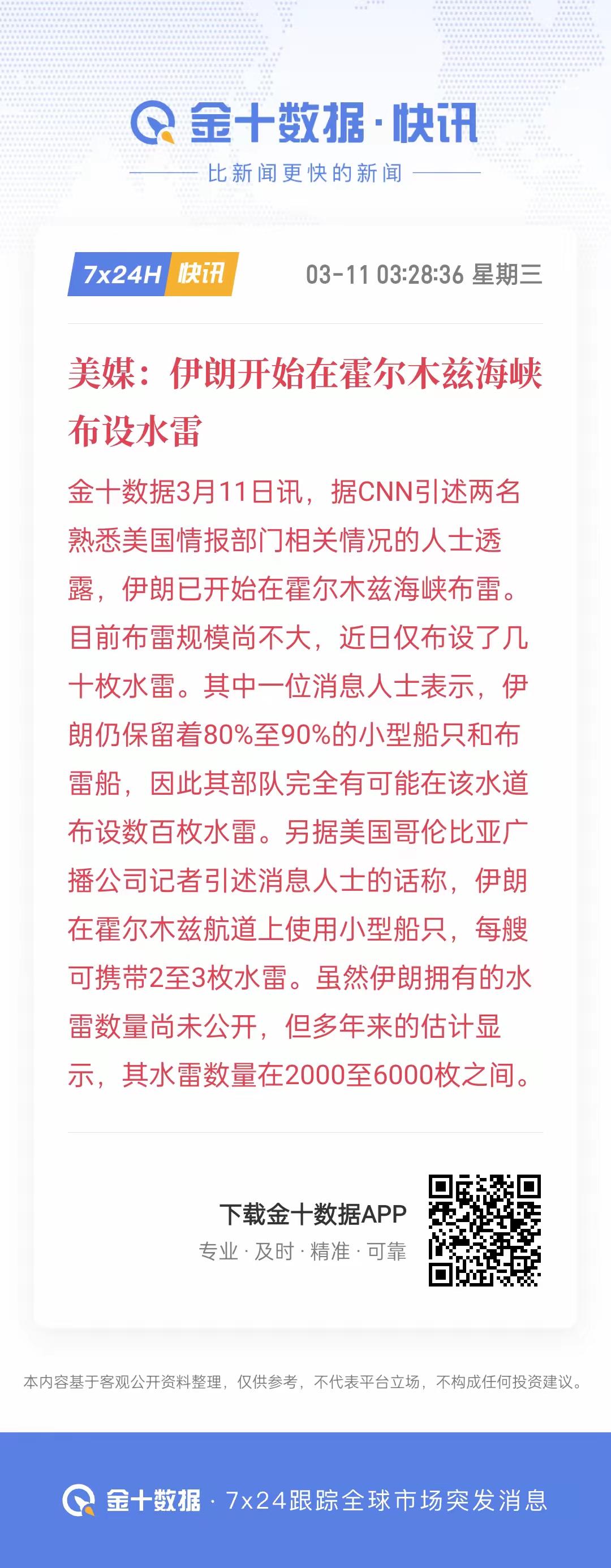 惊爆消息!水雷锁海峡!伊朗小范围布雷试探,油价运价再迎暴涨窗口 据CNN等美媒援引美国情报人士消息,伊朗已开始在霍尔木兹海峡小范围布设水雷,目前仅投放数十枚,但仍保留80%-90%布雷船只与2000-6000枚水雷储备,具备快速扩布数百枚的能力。这一行动被视为伊朗升级非对称威慑的关键一步,全球能源市场再度绷紧神经。 此次布雷以小型船只隐蔽作业为主,单船可携带2-3枚水雷,刻意避开航运密集区,既制造航道恐慌,又避免直接触发全面战争。五角大楼已监测到布雷痕迹,并宣称摧毁多艘伊朗布雷艇,侧面证实行动真实性;伊朗则模糊回应,既不承认也不否认,保留战略弹性。 霍尔木兹海峡承载全球约20%的石油运输,水雷封锁将直接推高航运风险与能源价格。当前布伦特原油已突破118美元/桶,VLCC运价冲高至50万美元/天,若伊朗进一步扩布至数百枚,油轮或被迫绕道好望角,航程延长40%-100%,运价与油价有望再创新高。 分析人士指出,伊朗此举是“以小博大”的消耗战术:水雷清扫成本是布雷的200倍以上,美军中东反水雷力量薄弱,短期内难以彻底清除;同时持续推高油价,让美国与以色列陷入经济与政治双重压力。而俄罗斯则坐收渔利,能源收入与市场份额同步扩大,成为幕后最大赢家。 目前局势仍在发酵,市场正密切关注伊朗是否会进一步升级布雷规模,一旦形成局部封锁,全球能源格局将迎来剧烈震荡。 伊朗海峡危机 伊朗上空封锁 伊朗危情 伊朗船只 伊朗石油禁令 伊朗海域 伊朗港口大爆炸 伊朗资讯 伊朗码头事故 伊朗航设施 伊朗号 伊朗货轮 伊朗货船遇袭 伊朗走势分析 伊朗封锁线