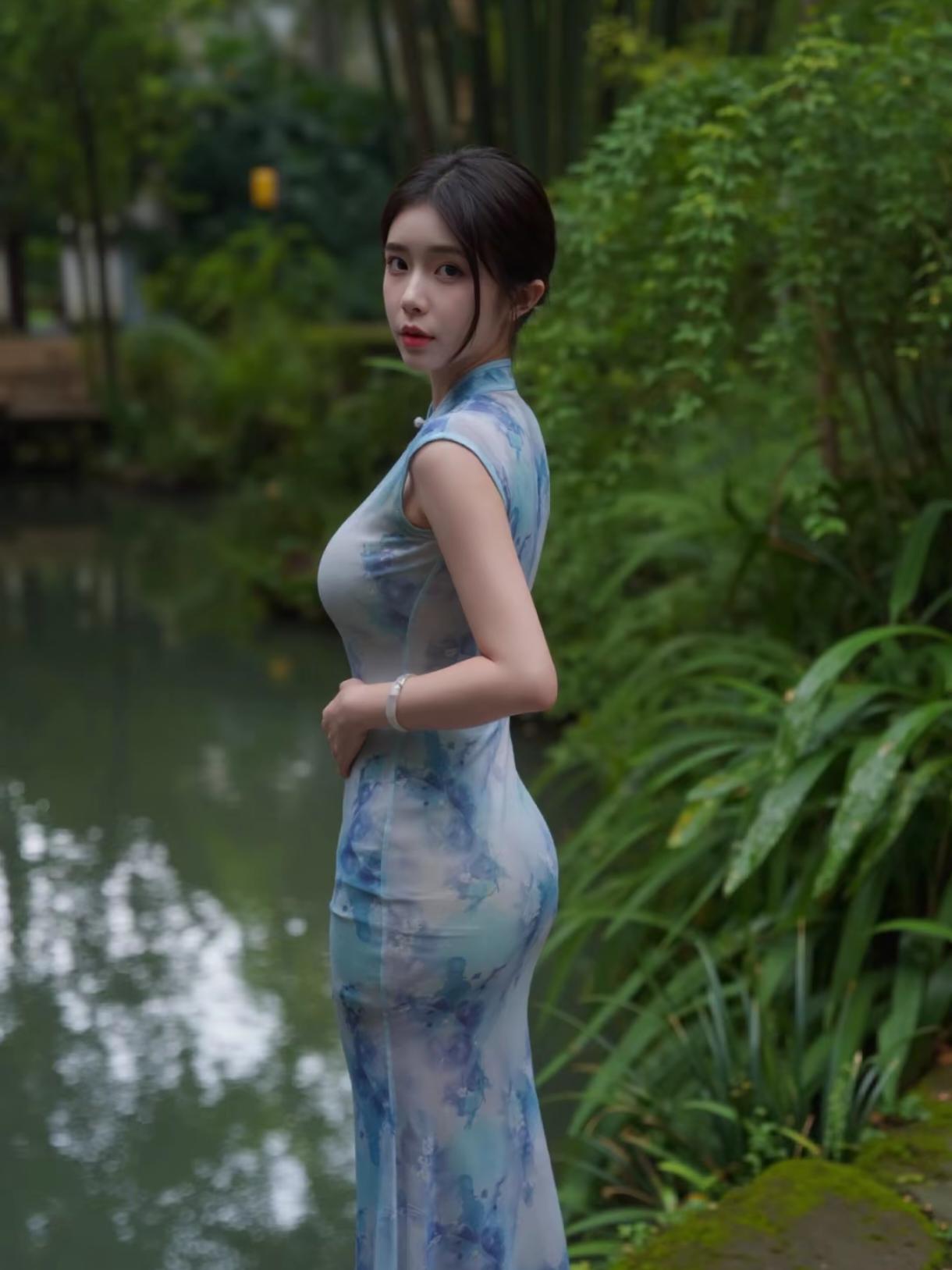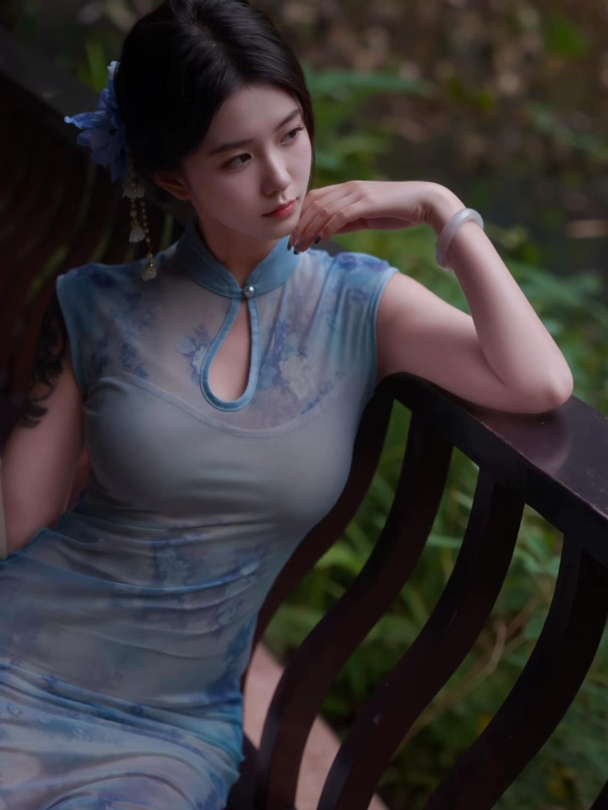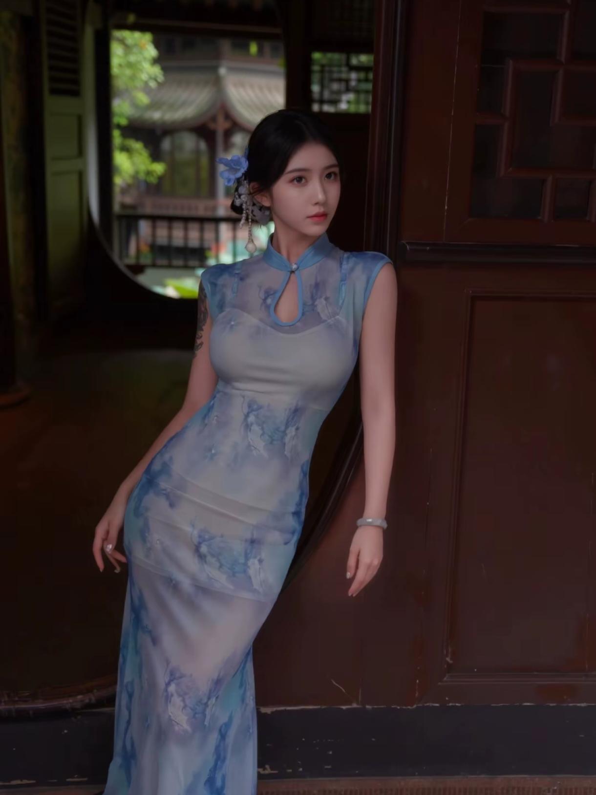 蓝晕旗袍,真的像把一整幅水墨画穿在了身上🌿 推开老宅那扇沉木大门时,光线忽然暗下来,只剩窗格漏进几缕碎光,落在青石板上。 淡蓝水墨印花的无袖旗袍,刚好衬得肩颈线条干净又温柔,胸前小开襟配着珍珠扣,是藏在细节里的精致。 面料轻薄又垂顺,走起来贴着身形却一点不紧绷,颜色跟院里的青石、竹影都融在了一起。 靠在栏杆上,手托着下巴,远处飘来几声鸟鸣,连风都慢了下来。