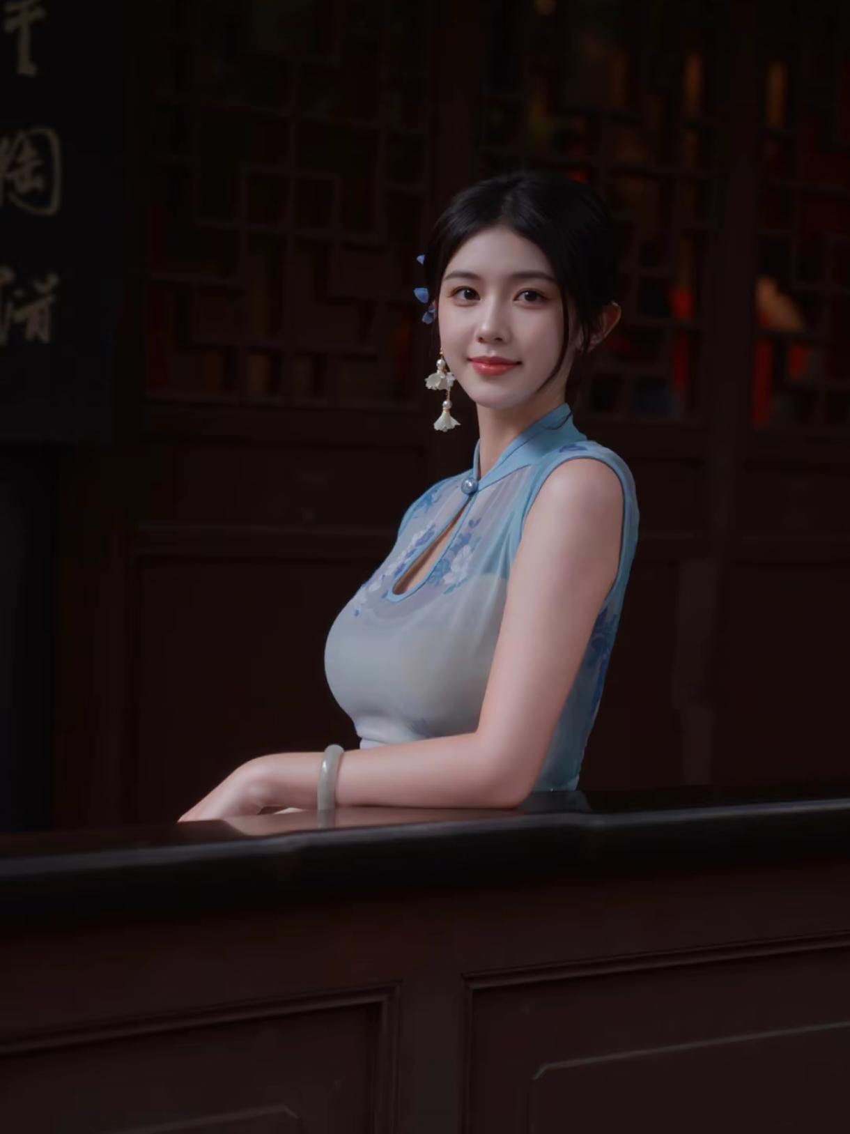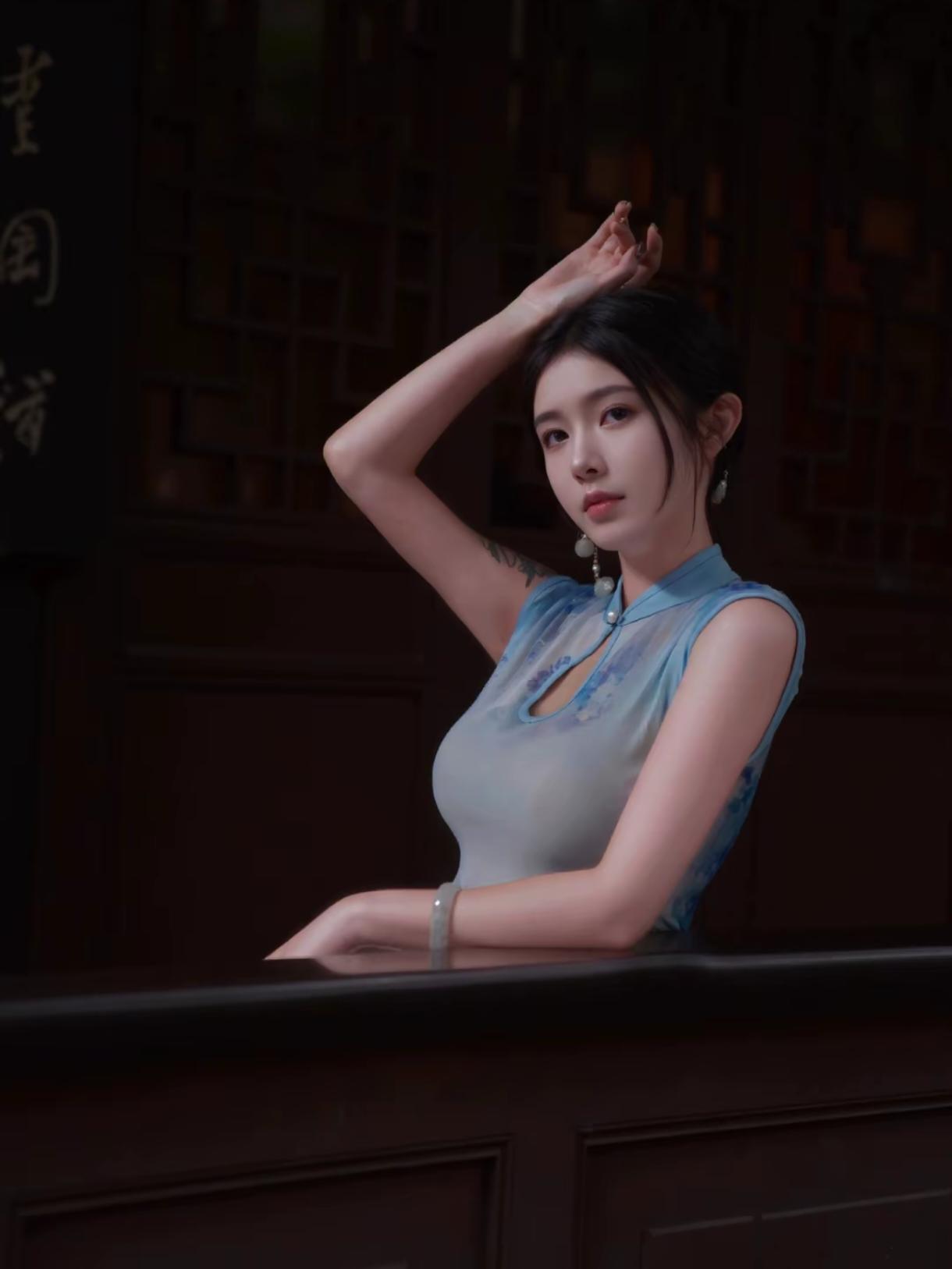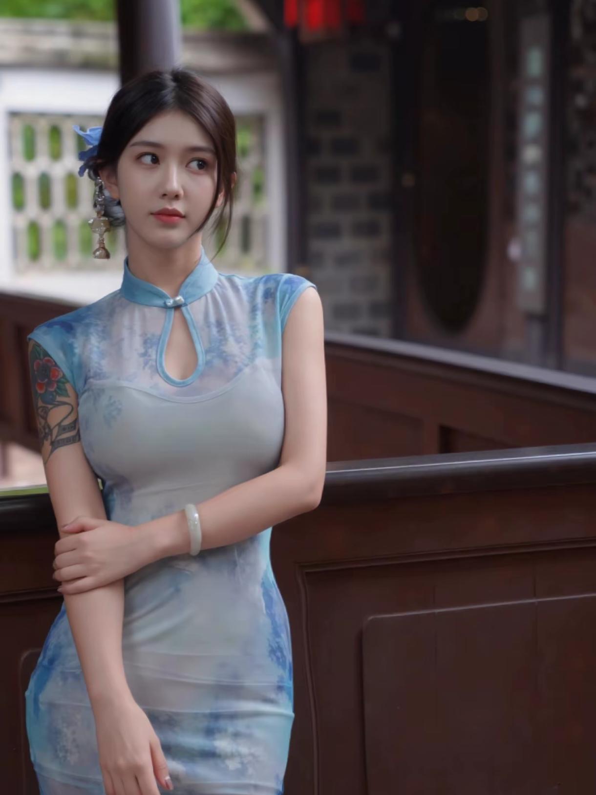 蓝晕旗袍,真的像把一整幅水墨画穿在了身上🌿 推开老宅那扇沉木大门时,光线忽然暗下来,只剩窗格漏进几缕碎光,落在青石板上。 淡蓝水墨印花的无袖旗袍,刚好衬得肩颈线条干净又温柔,胸前小开襟配着珍珠扣,是藏在细节里的精致。 面料轻薄又垂顺,走起来贴着身形却一点不紧绷,颜色跟院里的青石、竹影都融在了一起。 靠在栏杆上,手托着下巴,远处飘来几声鸟鸣,连风都慢了下来。
