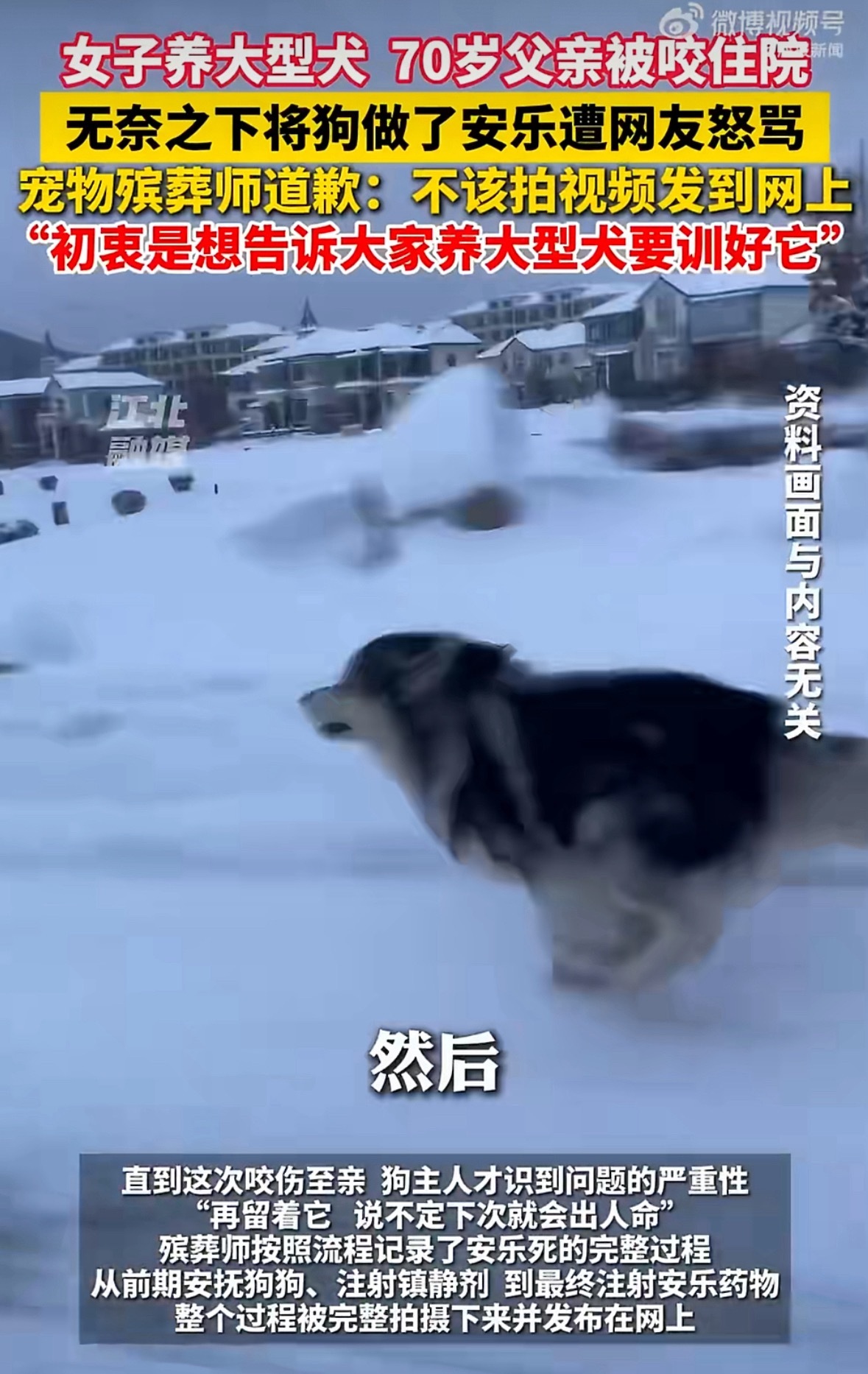 父亲被女儿百斤犬咬住院狗被安乐死说几个槽点:①家养大型犬阿拉斯加,100多斤,曾咬伤多人,直到把亲爹咬进了手术室,决定安乐死②宠物殡葬师记录了安乐死的过程发到网上,结果狗主人被集火③宠物殡葬师道歉,称初衷是文明养犬④查了一下,阿拉斯加这种肩高超61cm的大型犬,虽不属于烈性犬,在江苏多地也属于禁养大型犬只