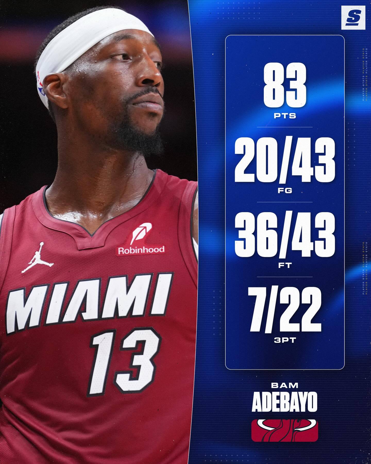 ——全场出战42分钟——投篮43中20,三分22中7,罚球43中36——狂砍83分9篮板3助攻2抢断2盖帽——第一节单节31分,第四节单节21分——本赛季第一个60+、70+、80+——单场得分超越科比,排名NBA历史第二——单场得分超越詹姆斯,排名热火队史第一——此前生涯单场最高分41分