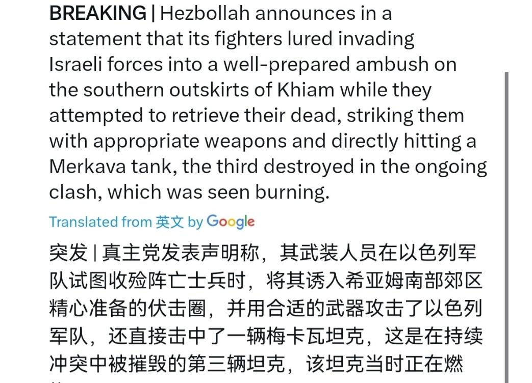 以色列军队中了埋伏,损失惨重!3月10日,黎巴嫩真主党发表声明称,以色列军队在希亚姆南部郊区进行侵略,而真主党利用打死了的以色列军人设下圈套,当以色列军人试图收回他们的死去的同伴时,真主党成员突然对这些军人发动进攻,武器袭击他们,并直接击中了一辆梅卡瓦坦克。 真主党这次的操作手法其实并不新鲜,但执行得特别狠,他们先通过先期打击让几辆梅卡瓦坦克失去战斗力,坦克起火冒烟的画面被他们反复强调。 等以色列部队按照惯例派出回收小组和支援力量,带着装甲车和人员赶到现场试图拖走受损装备、转移伤亡时,真主党埋伏的战斗人员从多个方向同时开火,使用合适的武器直接命中目标,其中至少一辆梅卡瓦坦克被第三次确认击中并燃烧。 整个过程像链条一样环环相扣:先制造伤亡制造“必须救援”的压力,再把救援变成更大的暴露点,最后用饱和打击收网。 这种“双重伏击”的节奏,把以色列“不放弃任何一名士兵”的原则变成了对方最致命的软肋。 希亚姆坐落在高地上,能直接俯瞰以色列北部的胡拉山谷和加利利地区,真主党长期把它当成火箭弹和反坦克导弹的发射阵地。 以色列想推进到这里建立缓冲区,清除威胁,但地形太复杂:城镇废墟、岩石构造、地下工事网络到处都是,真主党拉德万部队对这些了如指掌。 他们不硬拼阵地战,而是把以军诱进预设的死亡区,利用熟悉的地道和掩体打完就撤,留给以军后续空袭的往往是空壳。 昨天的行动就是在这种背景下发生的,以色列部队推进到郊区,回收任务刚展开,真主党就抓住时机把三辆梅卡瓦坦克全部打成燃烧状态,现场一片混乱。 梅卡瓦坦克虽然防护强,但面对顶攻型反坦克导弹和多点协同打击,生存率还是会大幅下降,回收行动需要人员聚集、车辆靠近,恰恰给了对方无人机、迫击炮和导弹最好的窗口。 以色列虽然有空中支援,但山地和城镇结合的环境限制了精确打击的发挥速度,真主党基层单位独立性强,即使高层压力大也能快速调整打法。 真主党通过这种方式不断抬高以色列的作战成本,消耗其后勤和士气,同时也在心理战上占上风:每一次回收失败,都会让以军内部质疑地面行动的可持续性。 以色列的目标是通过控制高地切断真主党东线补给、削弱其对北部定居点的威胁,真主党则死守这里证明自己即使遭受重创,组织和战斗力依然完整。 双方都在避免全面摊牌,但这种高强度消耗战让平民付出代价最大:城镇反复被炮击,居民不断北撤,基础设施几乎全毁。 昨天的事件把这种紧张推向新高度,真主党宣传中反复强调“直接命中”和“燃烧画面”,就是在用视觉冲击放大战果,而以色列方面则低调处理损失细节,双方都在为更长远的博弈留余地。 你们觉得这种针对回收行动的伏击会不会让以色列以后更谨慎推进地面部队? 个人观点,仅供参考!