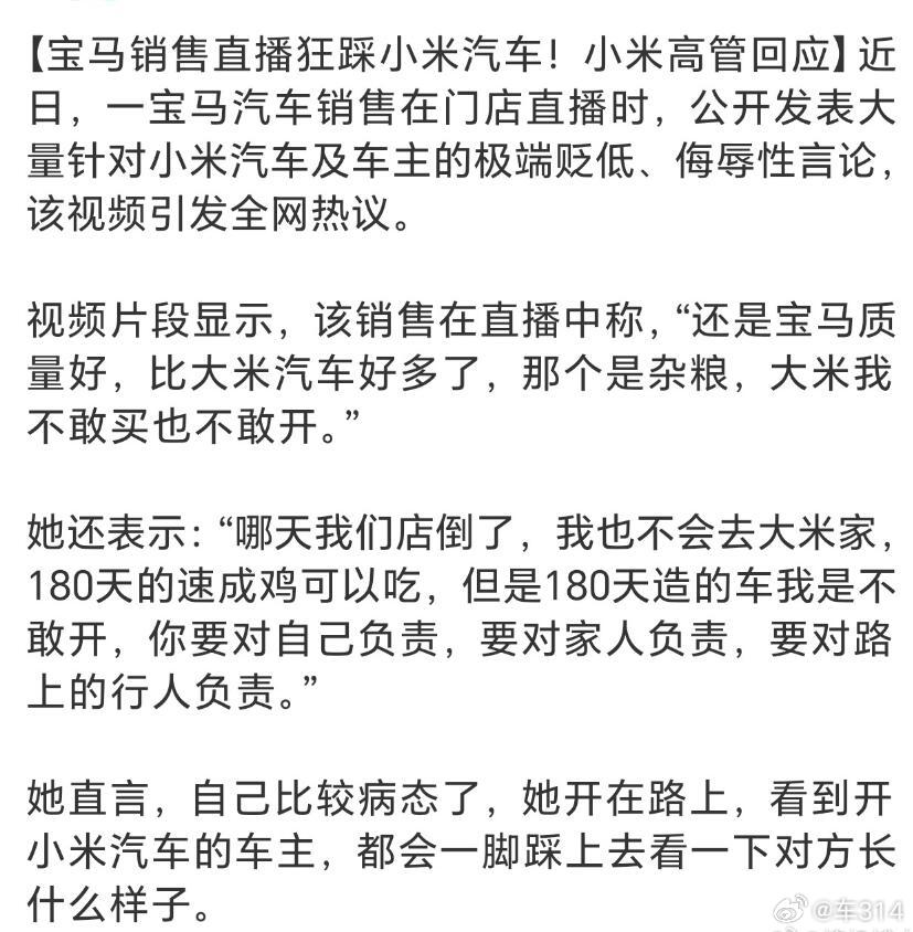 哈?卖宝马就可以diss国产品牌了?还说什么“180天的速成鸡可以吃,180天造的车不敢开”,但是满大街的小米SU7、YU7恐怕最能打脸了,新势力时代本身造车就快,关键是小米汽车的迭代频率已经够低了,这也能被喷,属实是没想到,要喷也是喷那些一年换三代的牌子吧?宝马这么大一个牌子,居然能让自己的销售顾问如此口出狂言,怪不得销量拉胯了。而小米高管的回应则很有格局,“智者应当保持开放的心态,持续学习新事物”,一下子就高下立判。奉劝某些米黑,你们在喷之前麻烦看看自己的学历够不够组织出有逻辑语言,OK?业内人士谈小米汽车被销售嘲讽小米高管高情商回应销售嘲讽小米汽车新一代小米SU7