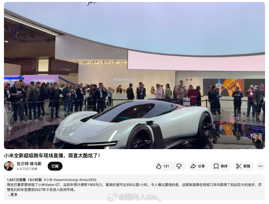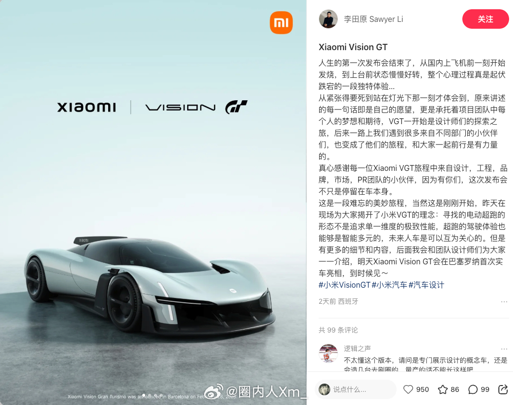 它最重磅的意义是:小米成为VGT项目史上第一个受邀的中国品牌,也是第一个以科技公司身份加入的品牌,和法拉利、保时捷等百年豪门同场,实现中国汽车在全球顶级设计舞台的零的突破。小米Vision GT以极致低趴、流线车身、气泡座舱,打破传统超跑冷峻风格,我们中国设计的汽车也可以让外国人羡慕,并且外国网友称‘苹果没做成的。小米做到了。’