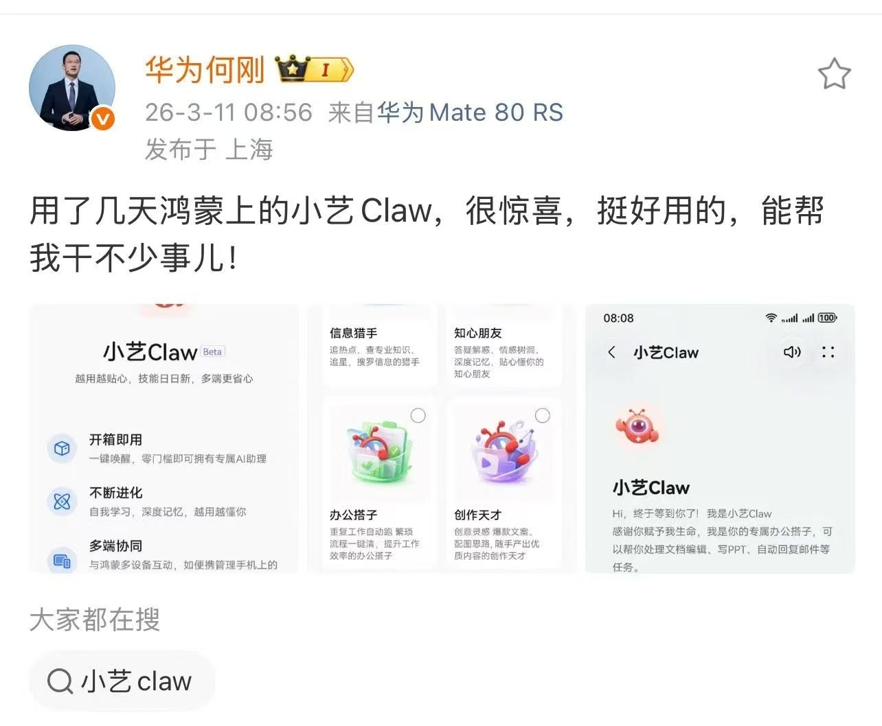 华为也能“养龙虾”,何刚晒鸿蒙小艺Claw,通过小艺APP接入OpenClaw开源智能体框架,让你能拥有一个7×24小时的“私人专属AI助理”,不同于过去问一句答一句的AI聊天机器人,小艺Claw能记住你的习惯、长期保持上下文、甚至主动帮你拆解任务的类型,并且可以预设AI的性格和人设,甚至安装其他人分享的人格Skills。