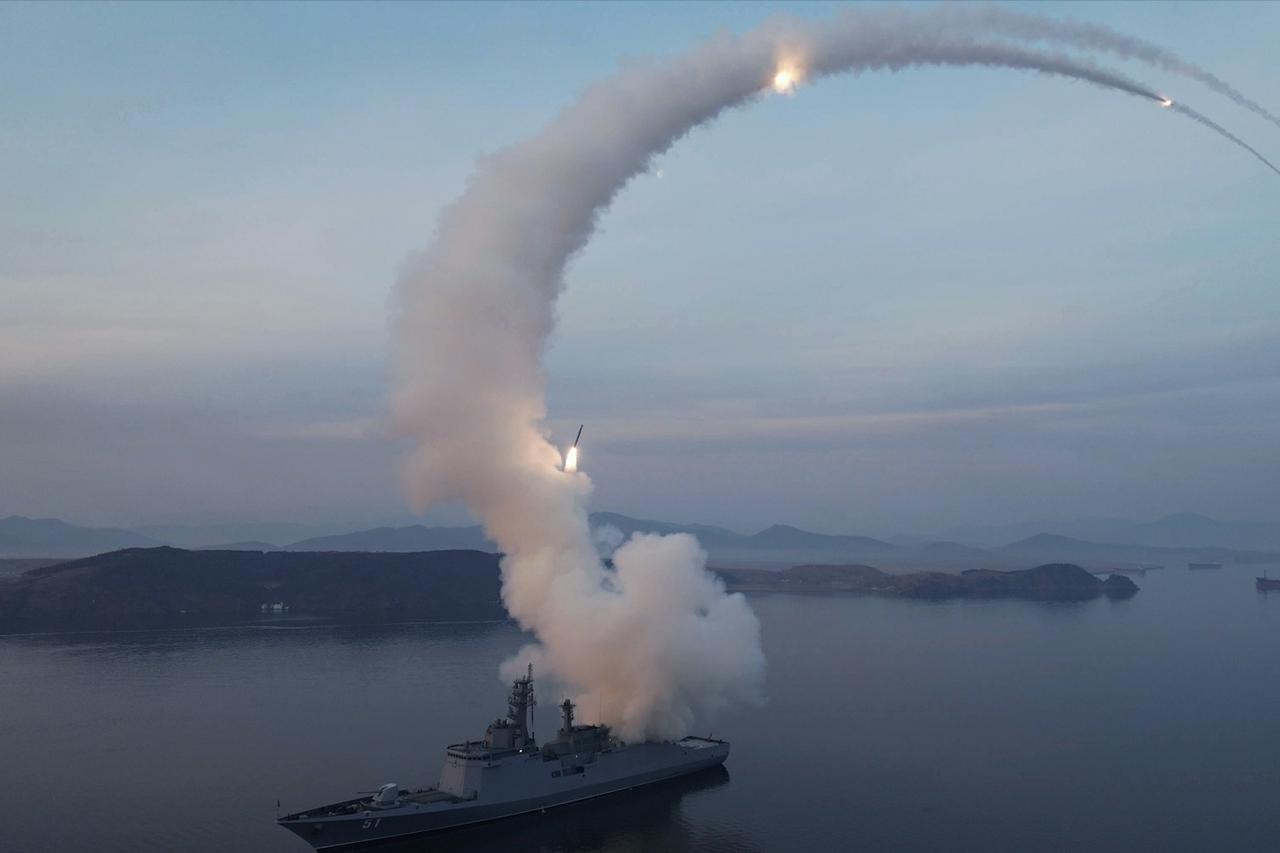 “崔贤”号驱逐舰一周内试射两款巡航导弹,“海对地巡航导弹”(图1)和“战略巡航导弹”(图2),展示远程对陆精确打击能力。