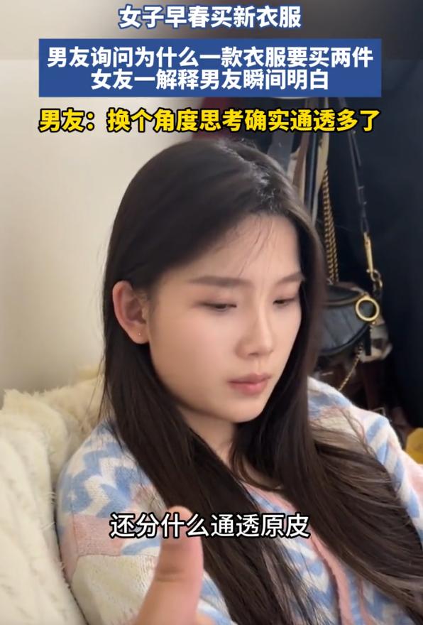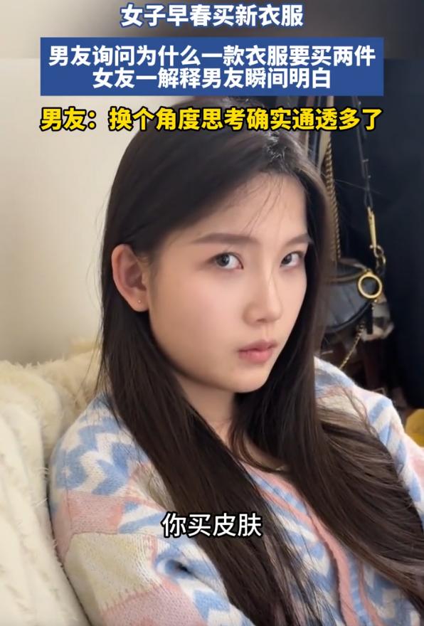 “同一件衣服为啥要买两件?”女子早春买了两件版型一模一样的衣服,男友看到后不理解,就反复追问这么买的目的,结果女友一句“你把它当场游戏皮肤”,男友瞬间秒懂。网友:我也喜欢这样买 当天,男子去帮女友取快递,可拿回来拆开后,就发现两件衣服一模一样,唯独颜色不同,男友不理解,就把衣服拿到女友面前询问:宝贝,我不理解,为什么同一款衣服要买两件? 女友回答说颜色不一样,但这并不是男友想要的回答,他还是不理解,为什么要这样购买,当初买的时候是怎么想的 女友说:你买皮肤不是也一个角色买好几个吗,还分什么原皮、炫彩 话还没说完,男友瞬间明白,表示自己听懂了,换个角度思考确实通透了 有网友说:我也是,有的衣服买回来版型质量颜色都喜欢,上身效果也很好我就囤几件或者降价了再买一件囤着 其实想想还真是这样,男生打游戏,为了一个角色买好几个皮肤,每个皮肤手感不一样,视觉体验也不一样,换着用特别爽 女生买衣服也是一样的道理,一件衣服穿出好几种感觉,今天是温柔风,明天是干练范儿,换件颜色就换了种心情 这不比游戏皮肤实在多了?至少能穿出门,能拍照发朋友圈,能在现实世界里收获一堆夸夸 其实这就是消费心理的性别差异。男生不理解女生为啥买同样的衣服,女生也不理解男生为啥在游戏里充那么多钱。但本质上都是一回事,为自己的快乐买单