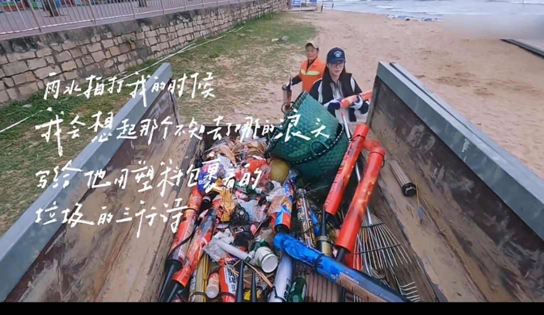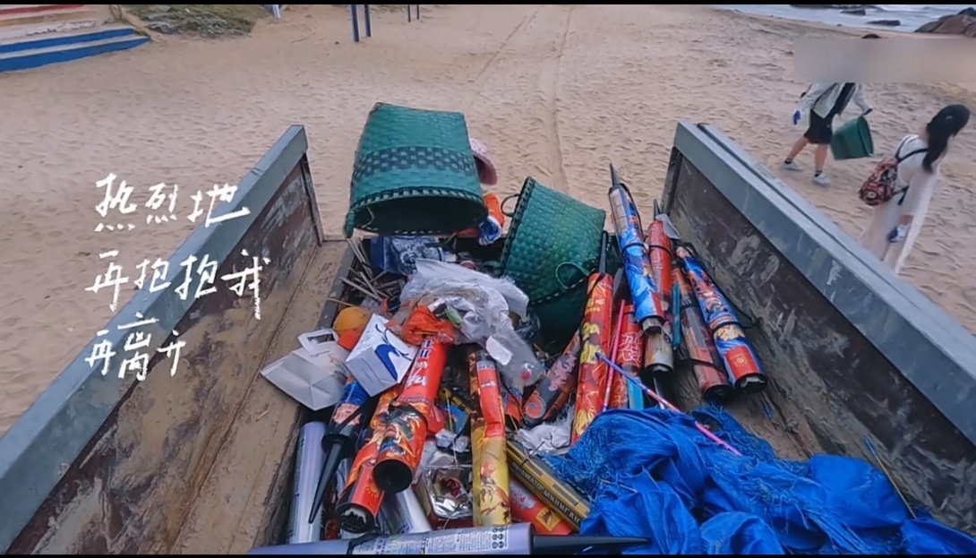 海南日月湾环卫工人一早上捡九车垃圾 平凡岗位,不凡坚守。日月湾环卫工人一早上清运9车垃圾,无机械助力,用汗水守护碧海蓝天。