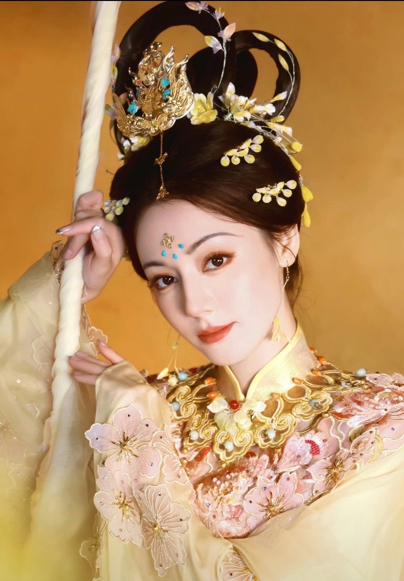 这是迪丽热巴的古风嫦娥造型,仙气十足✨她梳着精致的双环发髻,搭配鎏金点翠发饰与鹅黄珠花,额间的花钿点缀得眉眼更显灵动。浅黄渐变的广袖仙衣绣满粉樱纹样,云肩处的金饰与珠串华贵又飘逸,手持月杖的姿态温婉又清冷,完美还原了月宫仙子的古典韵味。