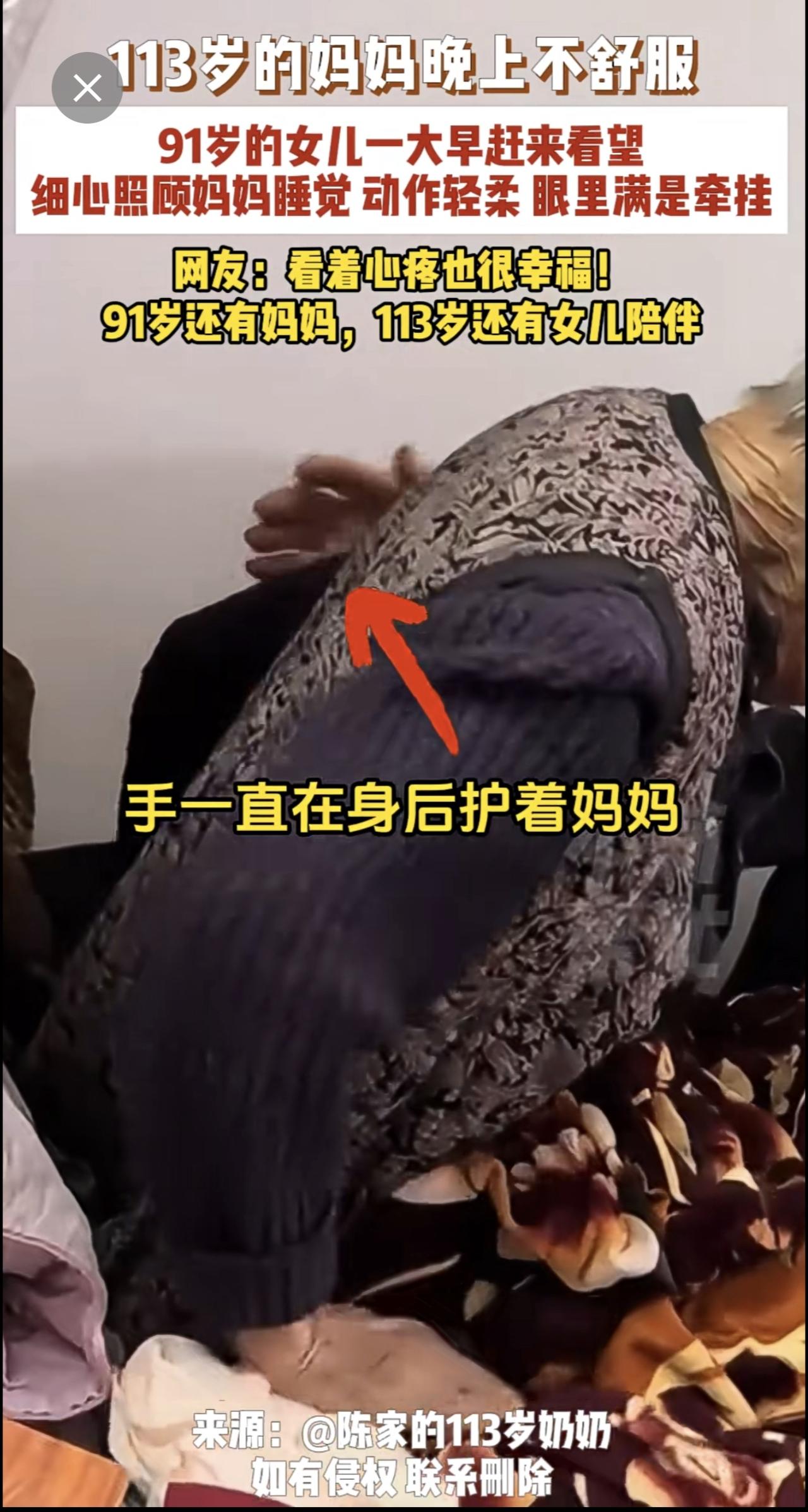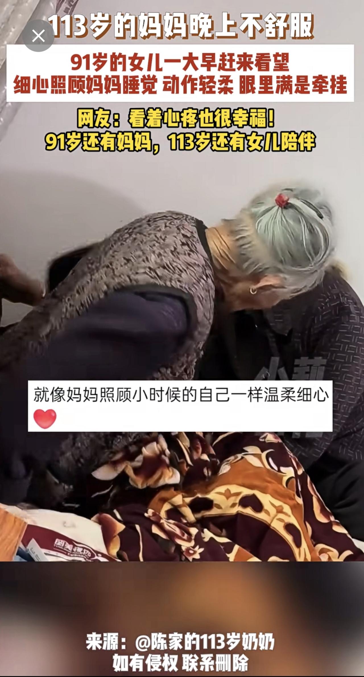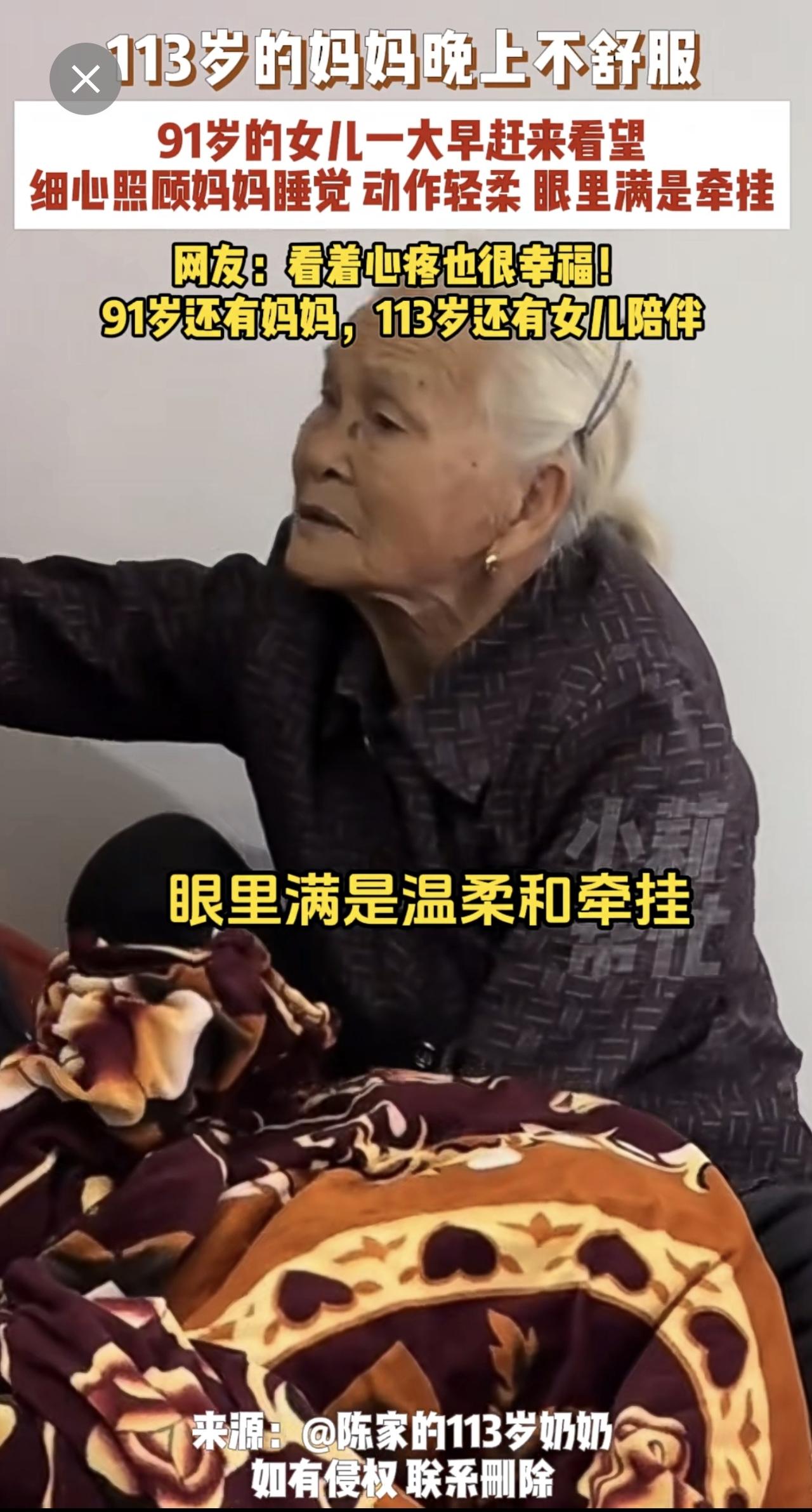 3月10日,广东,113岁的妈妈晚上不舒服,91岁的女儿一大早赶来看望,细心照顾妈妈睡觉,动作轻柔,眼里满是牵挂,网友:看着心疼也很幸福!91岁还有妈妈,113岁还有女儿陪伴。