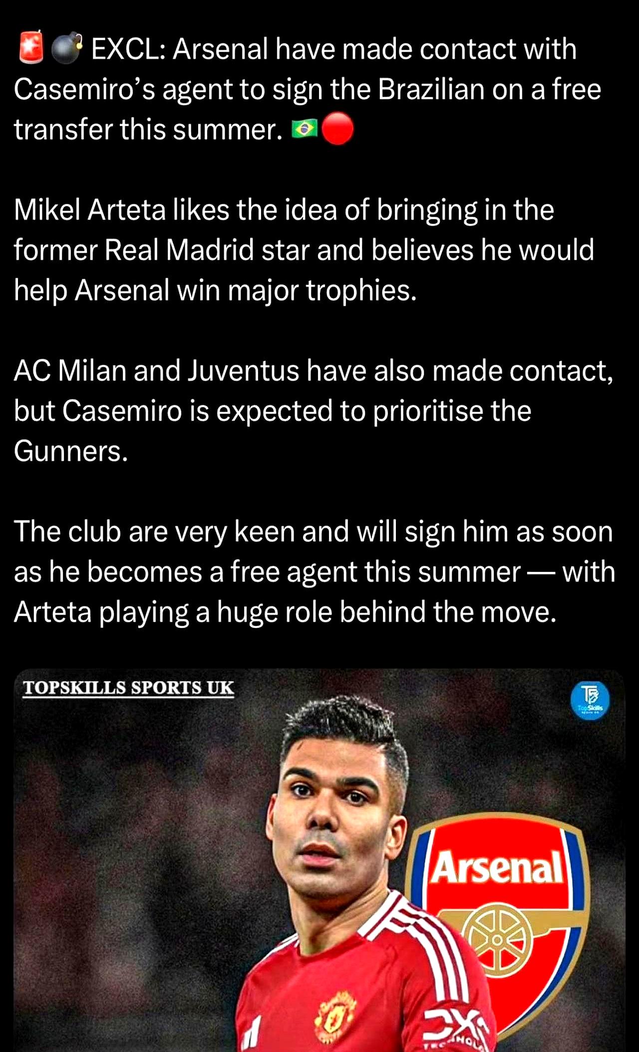 35万英镑周薪的卡塞米罗,曼联白送都不留,今夏直接自由身走人。 曼联今年1月就官宣不触发他的续约选项,多家权威媒体都实锤了,队友马兹拉维公开说这是全队的伤心日,足以见得他在队里的分量。 现在传闻阿森纳已经找他的经纪人接触,要他大幅降薪来当轮换补硬仗硬度,梅西所在的迈阿密国际,C罗所在的利雅得胜利也都在抢人。 不是曼联冷血不念旧功,而是中场重建刻不容缓。不是老将失去价值,而是各有各的前路要走。