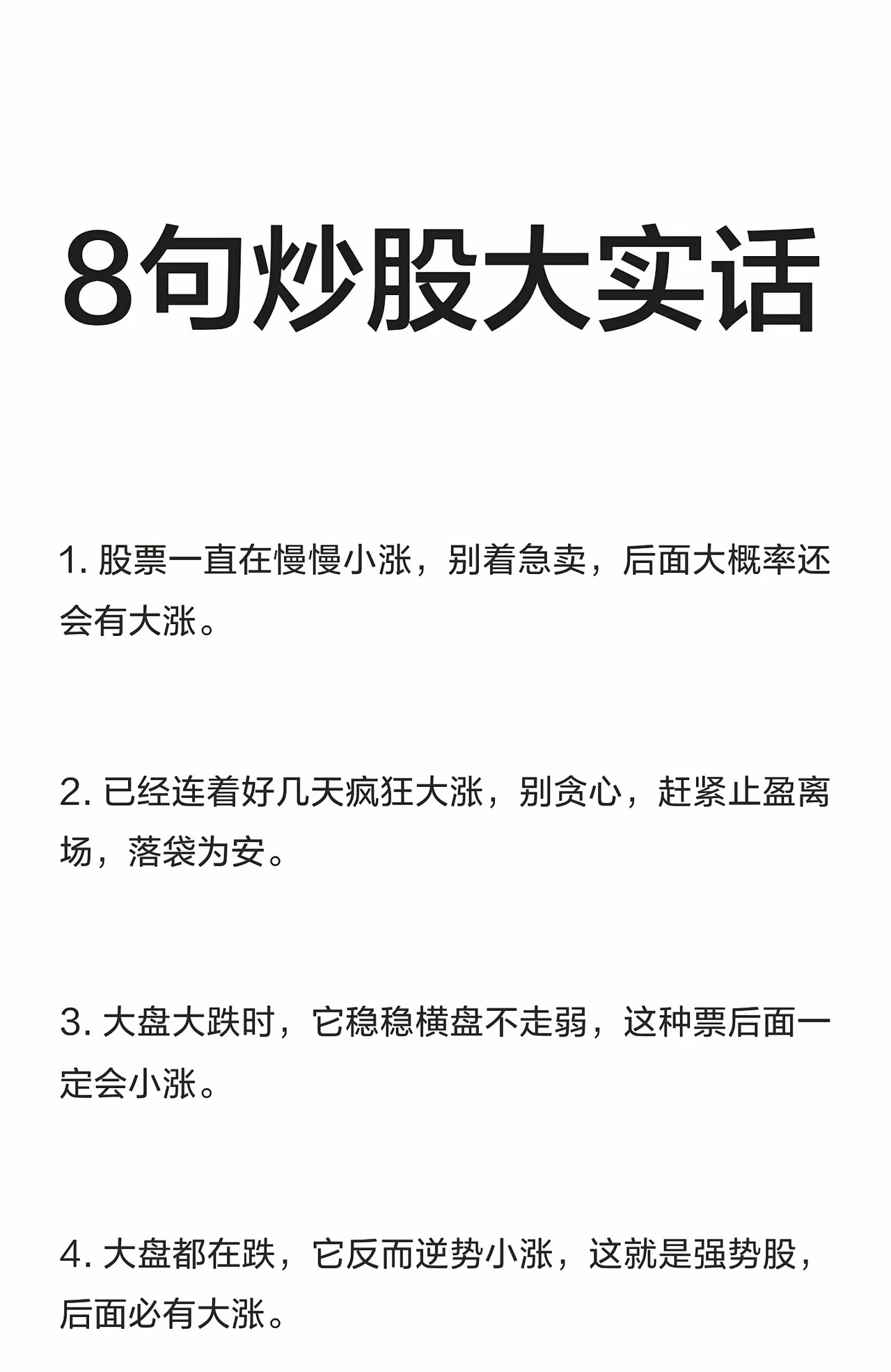 “8句炒股大实话”可以言简意赅地总结为以下四条核心交易法则:1. 顺势而为,抓准节奏* 上涨趋势:小涨莫急卖,有望大涨;连续疯涨要止盈,落袋为安。* 下跌趋势:大盘跌时横盘或逆势上涨,是强势股,后市看涨;大盘涨它不涨甚至下跌,则预示风险。2. 量价关系,看穿主力* 缩量下跌:通常是主力在“洗盘”,吓跑散户,不用慌。* 放量下跌:说明大资金在“偷偷出货”,是危险信号,应立即清仓。3. 强弱对比,辨别机会* 个股与大盘的对比是判断强弱的关键:大盘跌它稳或涨,是机会;大盘涨它弱或跌,是风险。4. 交易纪律,反人性操作* 在行情疯狂时要克制贪婪,及时止盈;在看似恐慌时要保持冷静,识别洗盘。一句话终极总结:顺大势、比强弱、看量价,涨不贪、跌不慌、放量是危险。