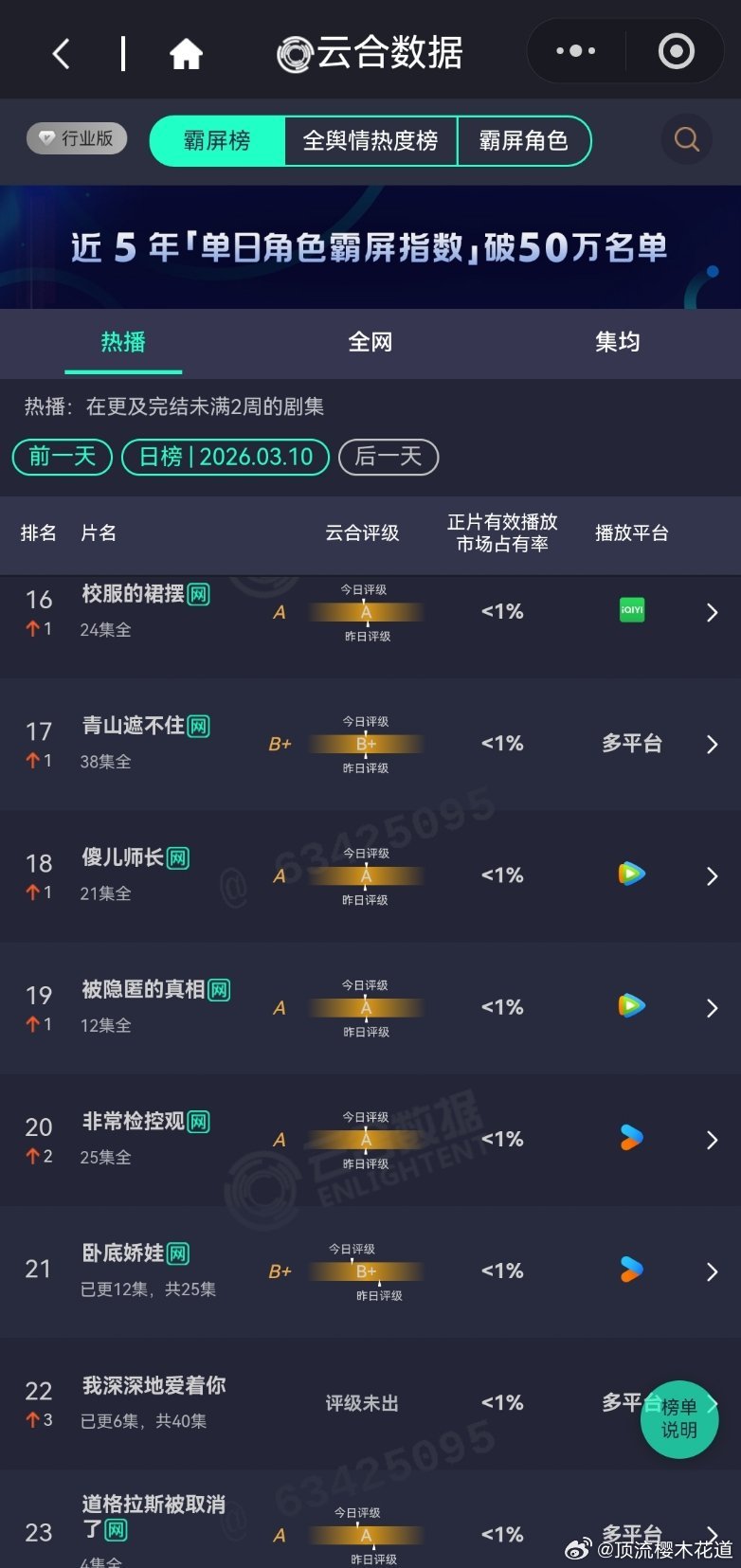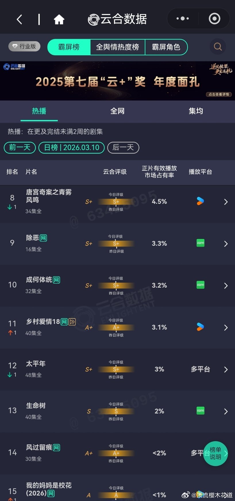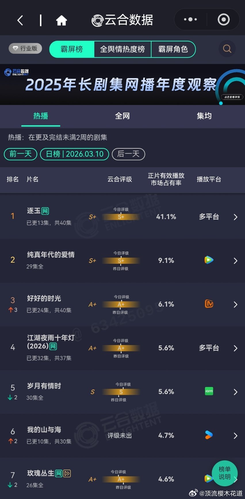 3月10日云合播放占比云合 VS酷云逐玉云合41.1% 酷云40.35%双平台大热是肯定有了,可惜的是没有带动大盘大涨。我的山与海云合4.7%酷云5.1%观众都去哪了?