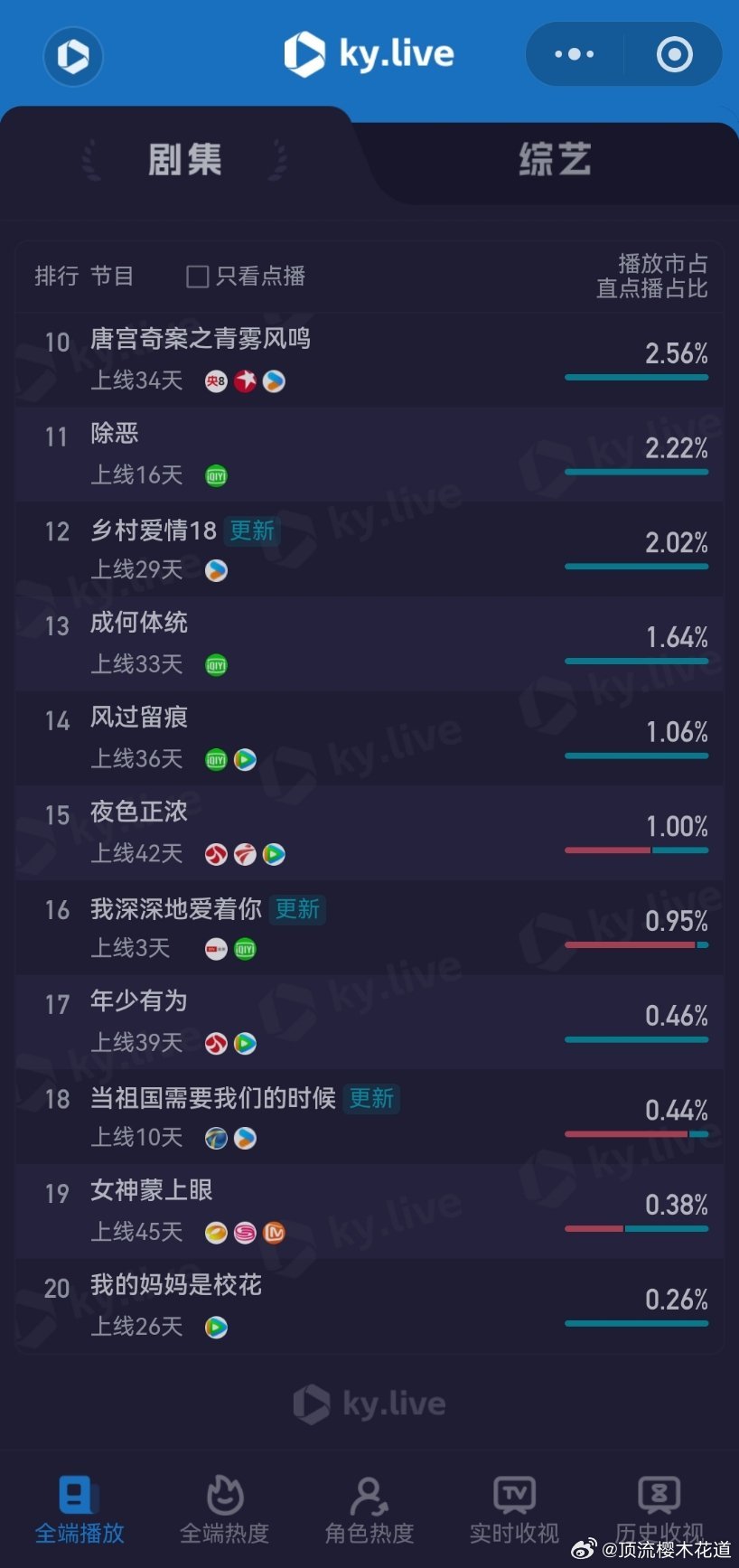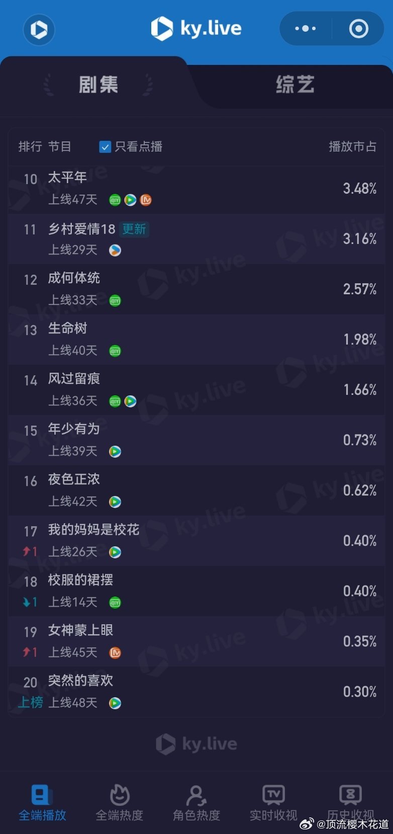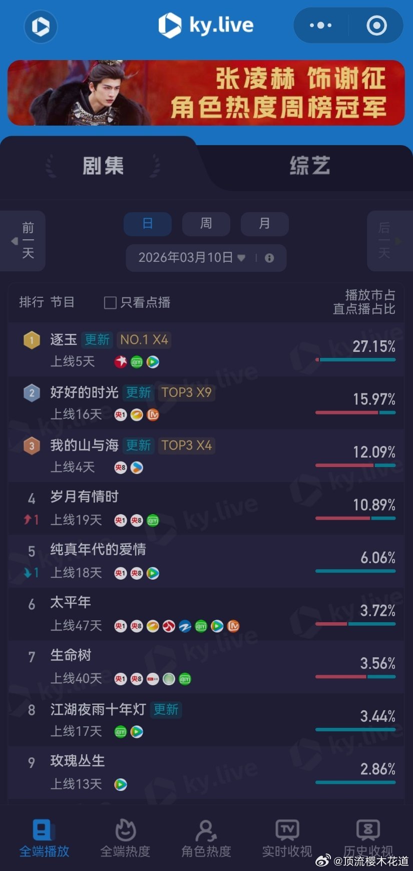 3月10日云合播放占比云合 VS酷云逐玉云合41.1% 酷云40.35%双平台大热是肯定有了,可惜的是没有带动大盘大涨。我的山与海云合4.7%酷云5.1%观众都去哪了?