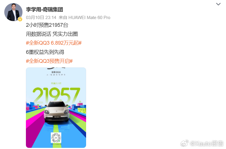 3月11日,全新奇瑞QQ3 EV开启预售,共推出4款车型,预售价区间为6.8920-8.9985万元。新车预售2小时,订单达21957台。汽场全开全新奇瑞qq全新奇瑞QQ3预售2小时订单破两万