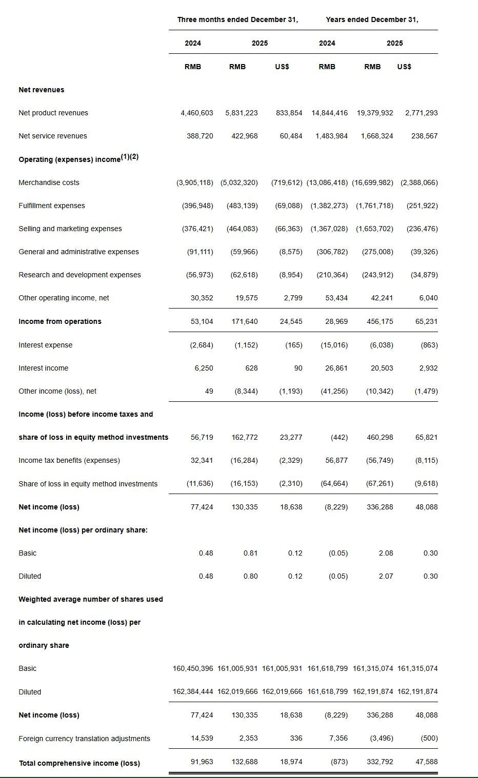 万物新生(爱回收)2025年营收210.5亿元,净利润3.4亿元 2025年第四季度财务业绩 总净收入62.542亿元,同比增长29.0%。产品净收入58.312亿元,同比增长30.7%。服务净收入4.230亿元,同比增长8.8%。成交的消费产品数量为1100万件,而2024年同期为940万件。 运营成本与费用61.021亿元,同比增长26.4%。商品成本50.323亿元,同比增长28.9%。履约费用4.831亿元,同比增长21.7%。销售和营销费用4.641亿元,同比增长23.3%。一般及行政费用6000万元,同比下降34.1%。研发费用6260万元,同比增长9.8%。这主要归因于人员成本增加。 营业利润1.716亿元,同比增长223.2%。调整后营业利润(非美国通用会计准则)1.815亿元,同比增长38.1%。净利润1.303亿元,同比增长68.3%。调整后净利润(非美国通用会计准则)1.401亿元,同比增长14.0%。 2025全年财务业绩 总净收入210.483亿元,同比增长28.9%。产品净收入193.799亿元,同比增长30.6%。服务净收入16.683亿元,同比增长12.4%。成交的消费产品数量为4170万件,而2024全年为3530万件。 运营成本与费用206.343亿元,同比增长26.2%。商品成本167.000亿元,同比增长27.6%。履约费用17.617亿元,同比增长27.4%。销售和营销费用16.537亿元,同比增长21.0%。一般及行政费用2.750亿元,同比下降10.4%。研发费用2.439亿元,同比增长15.9%。这主要归因于人员成本增加。 营业利润4.562亿元,同比增长1473.1%。调整后营业利润(非美国通用会计准则)5.550亿元,同比增长35.5%。 净利润3.363亿元,2024全年净亏损为820万元,实现扭亏为盈。调整后净利润(非美国通用会计准则)4.282亿元,同比增长36.3%。 无论是2025年第四季度还是全年,总净收入都实现了较高幅度的增长,第四季度同比增长29.0%,全年同比增长28.9%。这表明公司业务规模在不断扩大,市场拓展取得了一定成效,产品或服务在市场上具有较高的需求和竞争力。