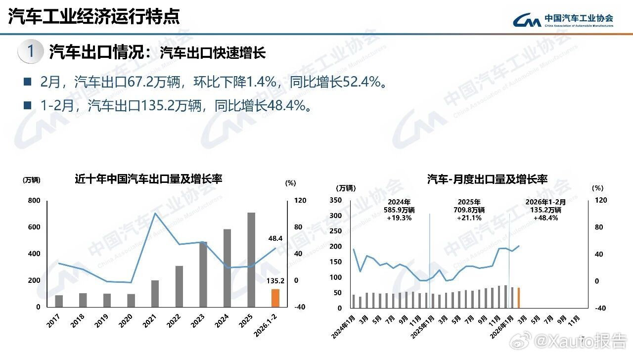 2月,汽车出口67.2万辆,环比下降1.4%,同比增长52.4%。1-2月,汽车出口135.2万辆,同比增长48.4%。2月,新能源汽车出口28.2万辆,环比下降6.6%,同比增长1.1倍;传统燃料汽车出口39.1万辆,环比增长2.8%,同比增长26.2%。1-2月,新能源汽车出口58.3万辆,同比增长1.1倍;传统燃料汽车出口76.9万辆,同比增长22.2%。(中国汽车报)汽场全开2月汽车出口67.2万辆新能源汽车