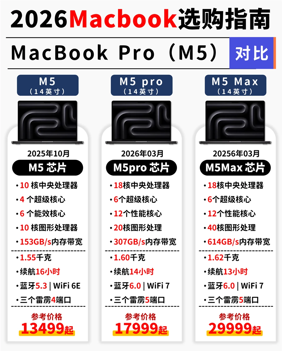 专业创作、重度剪辑、AI开发→MacBookProM5/M5Pro/M5Max