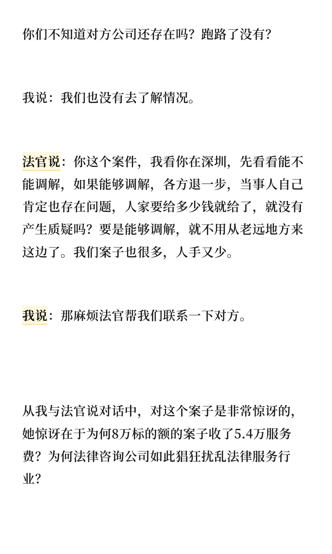 从我与法官说对话中,对这个案子是非常惊讶的,她惊讶在于为何8万标的额的案子收了5.4万服务费?为何法律咨询公司如此猖狂扰乱法律服务行业?