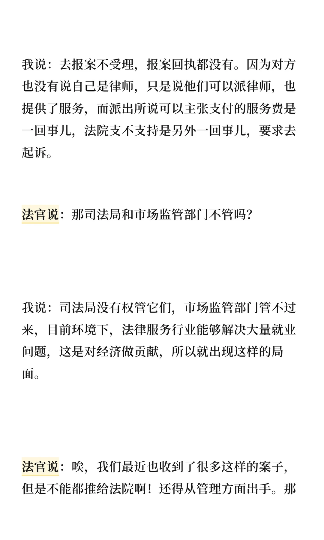 我说:去报案不受理,报案回执都没有。因为对方也没有说自己是律师,只是说他们可以派律师,也提供了服务,而派出所说可以主张支付的服务费是一回事儿,法院支不支持是另外一回事儿,要求去起诉。