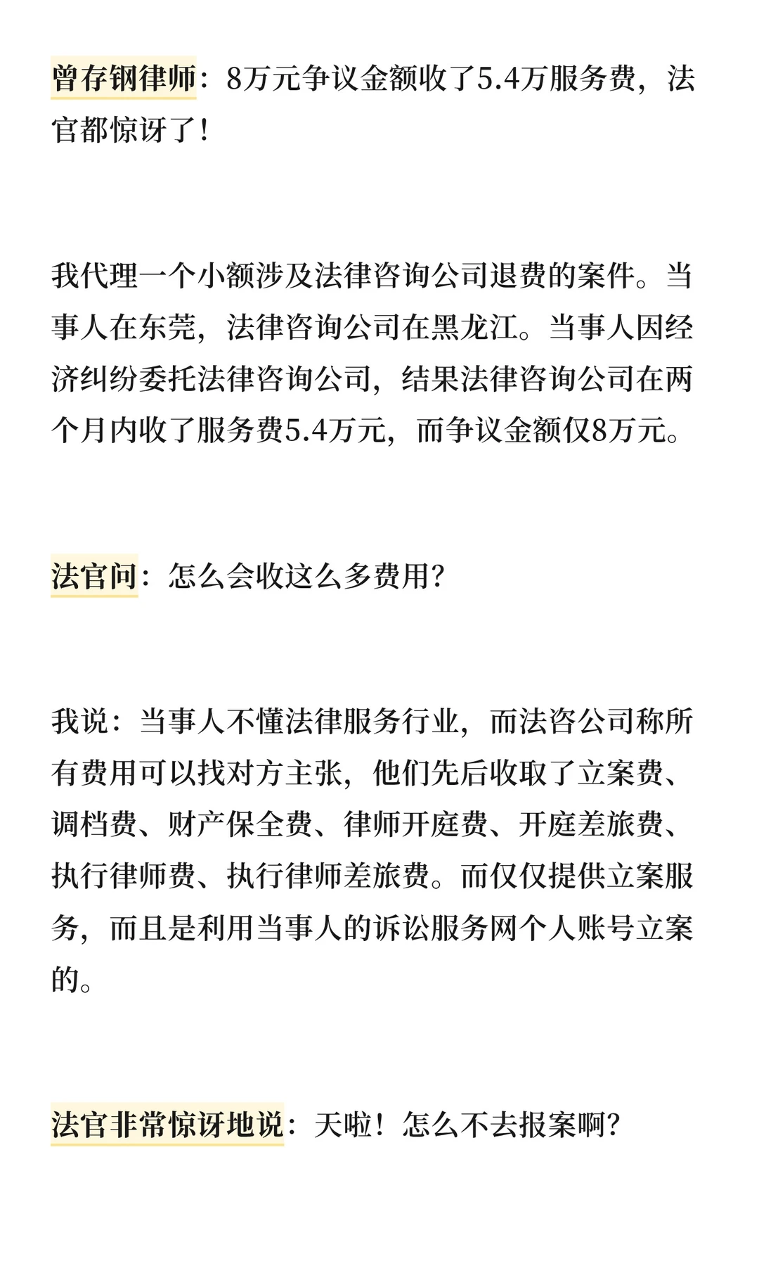 曾存钢律师:8万元争议金额收了5.4万服务费,法官都惊讶了!