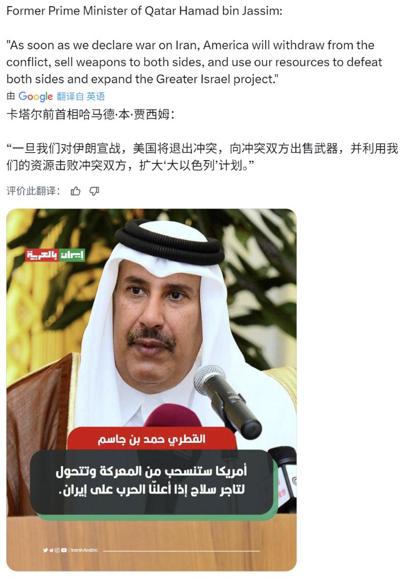 卡塔尔这位“政坛常青树”哈马德把话说绝了:如果阿拉伯人这时候真去替美以冲锋陷阵打伊朗,那不仅是输掉了家底,更是把子孙后代的地盘都给卖了。 在波谲云诡的中东政坛,摸爬滚打大半辈子的卡塔尔政坛常青树哈马德,一句直白狠厉的表态,瞬间戳破了笼罩在阿拉伯国家头顶的迷雾,也让外界看清了美国埋在中东的最深陷阱。 没有冠冕堂皇的客套,没有模棱两可的措辞,哈马德这番话,是历经无数地缘博弈后掏心窝子的大实话,字字戳中要害,更是给所有阿拉伯国家敲响了振聋发聩的警钟。 哈马德深耕中东政坛多年,见惯了大国搅局、派系纷争,更看透了美国在中东玩烂的套路。 长久以来,美国从不愿看到中东走向团结自主,反倒执着于制造可控混乱,靠着挑拨离间、拉一派打一派,牢牢拿捏中东局势,死死守护石油美元霸权这一核心利益。 眼下美以频频造势,试图把阿拉伯国家推上对抗伊朗的前线,看似是为所谓“地区安全”站台,实则是拿阿拉伯国家的利益当炮灰,想借阿伊内斗削弱双方势力,自己坐收渔翁之利。 哈马德看得通透,阿拉伯国家若是一时糊涂,真的替美以冲锋陷阵攻打伊朗,根本捞不到半分好处,反而会陷入无尽的战火泥潭。 这场战争只会耗尽阿拉伯国家积攒多年的家底,让地区经济崩塌、民生凋敝,更会彻底割裂伊斯兰世界的团结,埋下世代仇恨的种子。 看似是为美以站台,实则是亲手卖掉子孙后代赖以生存的地盘,把中东的话语权彻底拱手让人,沦为大国博弈的永久棋子。 这番不留情面的表态,没有丝毫虚浮的修饰,却道破了中东局势最核心的真相,哈马德用最直白的话语,提醒所有阿拉伯国家摒弃短视的执念。 看清外部势力的险恶用心,别被别有用心的挑唆裹挟,唯有守住地区团结、护住自身根基,才能守住当下的安稳,更能给子孙后代留下立足的底气,这也是中东国家摆脱外部操控的唯一出路。 本文内容皆为个人看法,如有更好的见解欢迎在评论区留言讨论。