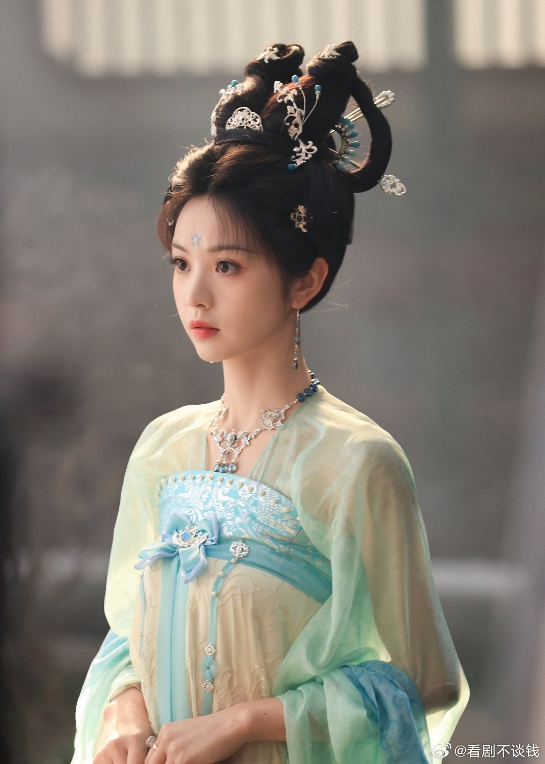李一桐《金枝》陈雀儿蓝色造型路透, 完全是古偶孔雀塑来的!!