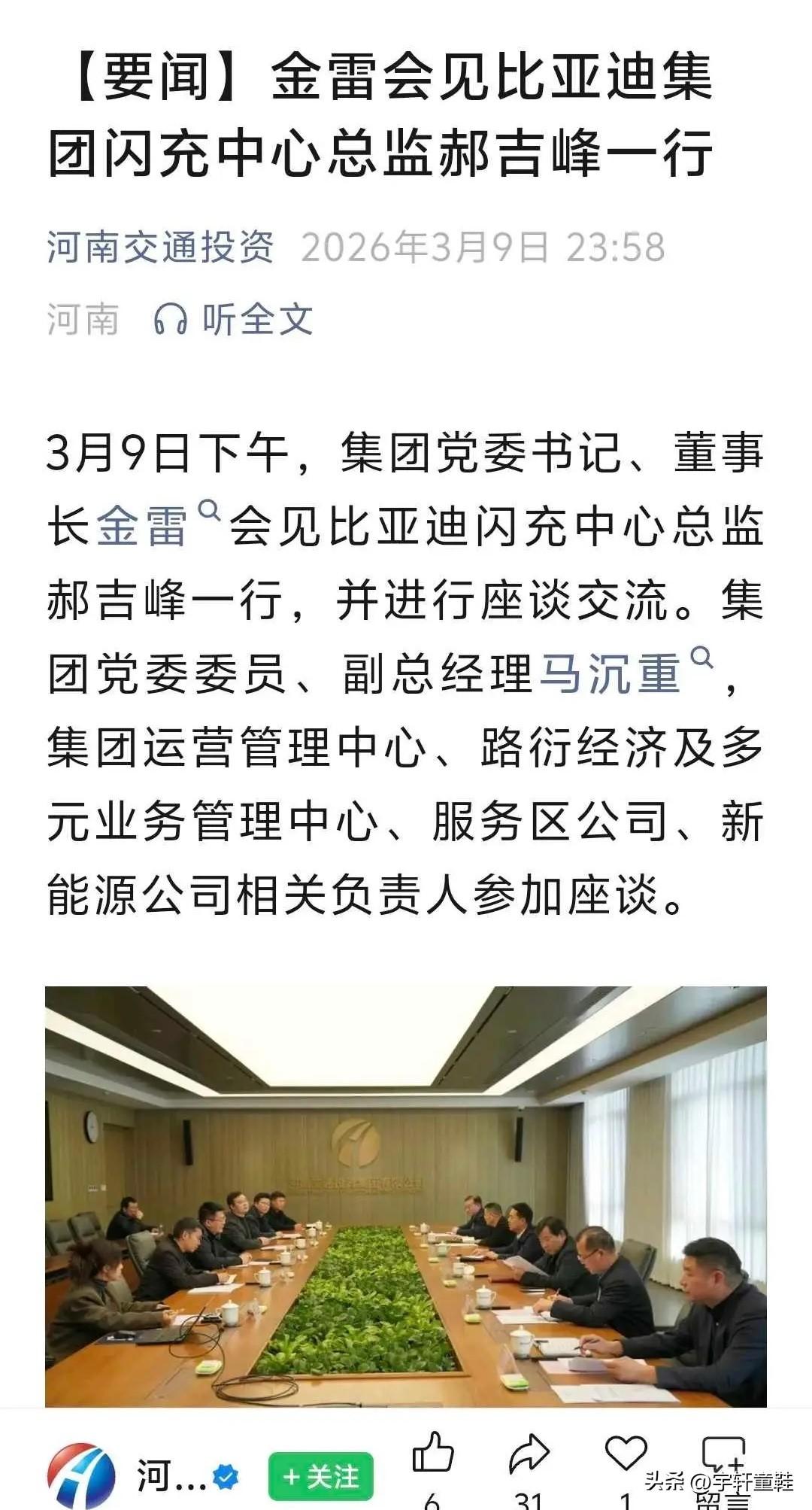不得了! 比亚迪这回动静闹得有点大呀!大家猜猜下一个跟比亚迪合作的会是哪个省? 继甘肃省高速公路服务集团公司就闪充合作事项到访比亚迪深圳总部被曝出后,河南省交通投资集团公司也晒出了集团公司党委书记、董事长一行就闪充合作事项到访比亚迪深圳总部文章! 话说,国企已经开始带队吃螃蟹了!你们还瞎愁个啥?
