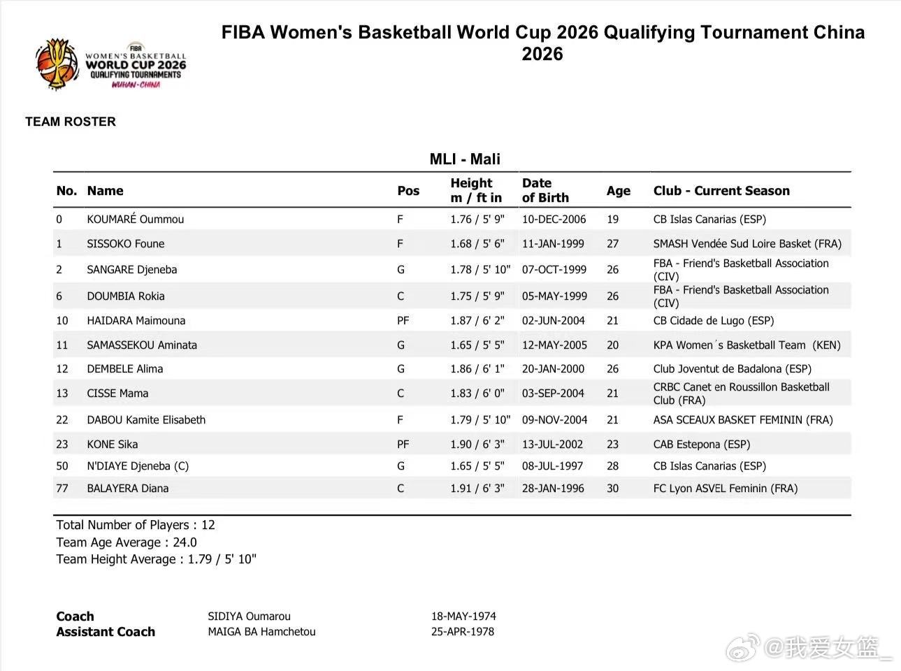 【女篮世资赛今日开战 首战马里不可轻敌】今晚19点30分,中国女篮将在世资赛首战对阵非洲亚军——马里女篮。虽然马里的整体实力不是很强,但仍有一些亮点,中国女篮不可轻敌。女篮世界杯资格赛 马里女篮12人名单如图1,可以看到她们虽然是非洲球队,但实际上有5名球员效力于西班牙联赛,4名球员效力于法国联赛,说是一支欧洲球队也并不为过。23岁的科纳是马里女篮的核心球员,去年的女篮非洲杯科纳入选了最佳阵容,上一届女篮世界杯预选赛与中国女篮的比赛科纳拿到了10分9个篮板的数据,当时科纳还以场均16.7分10.3个篮板的数据与李月汝和黄思静一起入选了贝尔格莱德赛区的最佳阵容。 科纳上赛季先后为WNBA球队神秘人和梦想效力,合计出战19场比赛,场均可以贡献1.4分1个篮板0.3次助攻,2024赛季效力于神秘人期间场均可以贡献8.6分4.3个篮板1.1次助攻的数据。 总体上说,中国女篮在身高、经验上都有着明显的优势,但马里女篮也有一定的特点,想要轻松取胜也不容易。中国女篮,首战加油!
