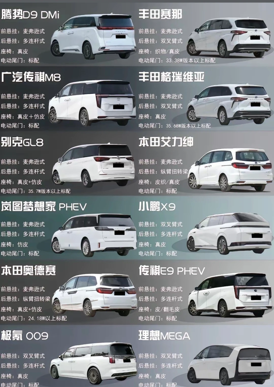 选 MPV 不用被 “商务”“家用” 的标签困住,核心就看你是要 “省心代步”“商务撑面” 还是 “家庭全能”,这十二款热门车型各有侧重,按场景选才不踩坑。 腾势 D9 和传祺 E9 是家用首选。腾势 D9 空间灵活,二排航空座椅舒适度拉满,满员出行也不挤;传祺 E9 混动版油耗低,市区代步成本低,就是第三排空间稍紧凑,适合二胎家庭日常通勤、偶尔长途。 商务家用双栖,别克 GL8 和丰田赛那稳坐标杆。GL8 商务气场足,二排独立座椅是接待利器,就是油耗偏高、市区开略笨重;赛那胜在均衡,油耗比 GL8 友好,家用更省心,可惜第三排和后备箱空间一般,适合兼顾轻商务的家庭。 腾势 D9 创始版配置拉满,空间和舒适性拉胯同级,适合追求品质的多口之家;埃尔法是高端商务标杆,二排航空座椅堪称移动会客厅,就是价格溢价高,家用选它属实 “大材小用”,更适合商务接待。 雷克萨斯 LM 和丰田 Granvia,主打极致舒适与尊贵。LM 的四座御世版是顶级商务之选,隐私性拉满,就是实用性一般;Granvia 空间更大、更家用化,适合追求高端体验又不想丢实用性的家庭。 说到底,MPV 选车核心是 “空间与场景匹配”。纯家用选腾势 D9 或传祺 E9;要兼顾商务接待,选 GL8、腾势 D9 创始版;追求顶级舒适与排面,再考虑埃尔法、雷克萨斯 LM 这类高端款,别为了面子忽略日常使用的实用性。