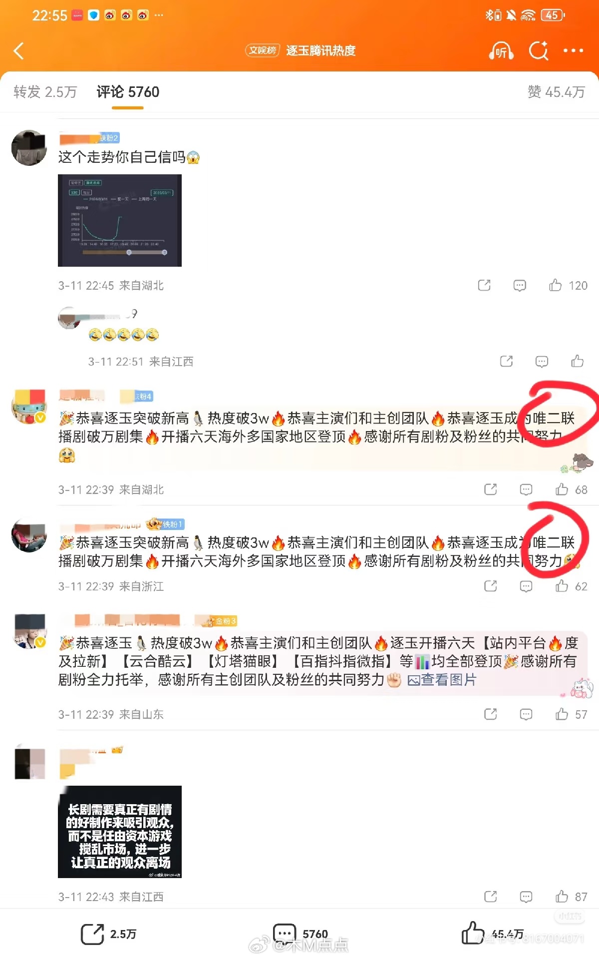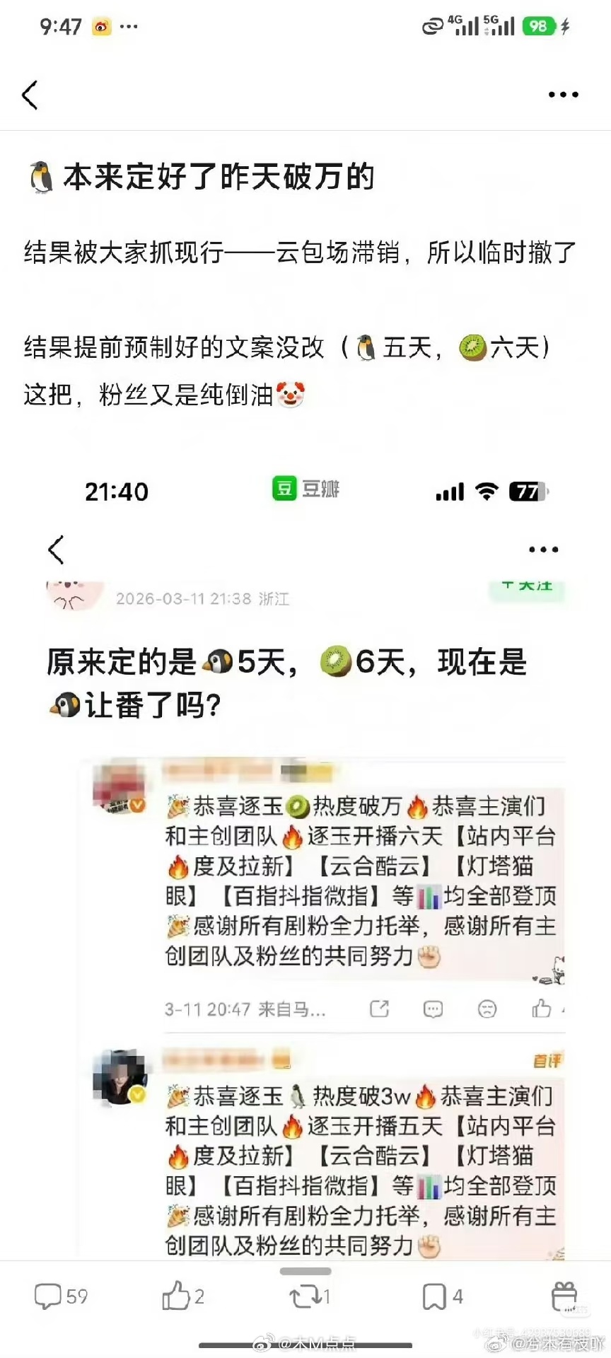 本质就是公平的问题,现在的剧粉丝多少都会通过各种手段买氵把数据做好,但是大家凭自己的氪金或者人头做来的,心服口服,本来大家都是氪金的,来个不氪金满级的碾压你,以后谁还跟你玩呢?品牌方不信任,粉丝也不信任了…我不懂搞这么一出有啥用啊~靠古偶剧又冲不了奖,打开知名度他俩泛人气其实已经还可以了也不需要,搞这些事实上又吸不了s忠粉,等于收获为0,还搞得其他粉圈路人逆反唯一就是他们自己粉丝可以吹实绩,但我觉得这个投入应该不会小吧,就为了满足一下两家粉丝的虚荣心吗,感觉也是赔钱买卖啊其实尴尬的在于剧并没有达到:全民一起追剧➕演员爆➕bgm爆➕梗出圈……哪怕只其中一项两项达成都行!而且一般大爆剧,演员是肯定会大爆的。更何况这剧的数据夸张到比全民追剧还猛,算是二倍全民追剧的数据了,那么演员怎么可能不爆。剧爆演员爆,观众是有感觉的。这剧比所有剧数据都碾压的状态,剧本身演员本身爆的却显得格外沉默给人一种一级一级撕上去的吃力感,现在撕点小流量,等积攒够人气和知名度了,就开始撕大些的,这套模板有人替他试过了,挺好用的。这kp也挺有意思,要换做别家早把自家大名打上去了,结果这剧连自家名字都不敢打上去好神奇的剧……这么快就破万了,还是双平台,后续男女主会接到很多商务吧,然后剧组会开演唱会~看到有个网友说:放心吧,过两个月就岁月史书了,美美拿到实绩,每个行业天龙人都一样😂我比较好奇后续接档的作品怎么办啊,那粉圈还包不包场了,这钱不花会被嘲,花了又冤枉后续的剧也太倒霉了吧