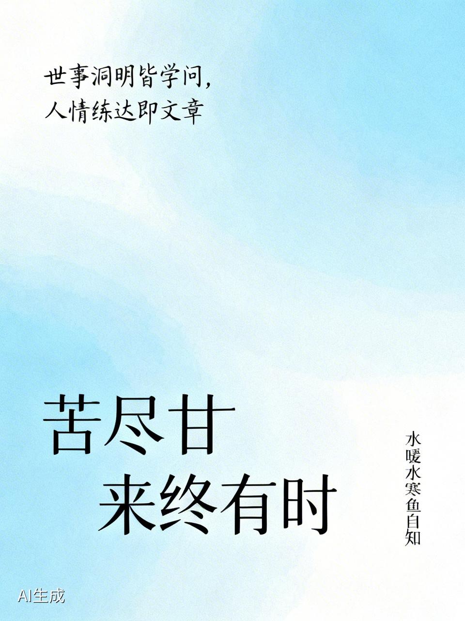 今天读到不少金句,太让人上头了。“世事洞明皆学问,人情练达即文章”,这可不是教咱圆滑,而是说最高级学问在人间,动人文章在懂人心。得看清规律、通晓温度,既不做书呆子式清高之人,也不做功利型精明之徒。 还有“苦尽甘来终有时”,这哪是鸡汤,是生理外挂。周文王被关时占卜出“否极泰来”,老外实验也证明大脑喜欢先苦后甜。不过也有人不爱这“糖水”,像同事阿豪裸辞画画,一句“水暖水寒鱼自知”,自己爽就行,这就是“本真”啊。