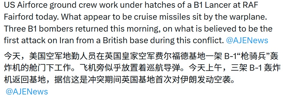 🔻看来USAF该怂的时候也挺怂的,英国费尔福德基地目前部署了12架B-1B轰炸机,昨天今天出动了3架打击了伊朗。🔻但是从现场英国围观群众拍的照片来看,B-1B装载的是旋转弹舱打的JASSM隐身巡航导弹。🔻原本还指望你去超音速高空突防甩JDAM呢,结果和B-52一样丢远程巡航导弹?那你来干什么?