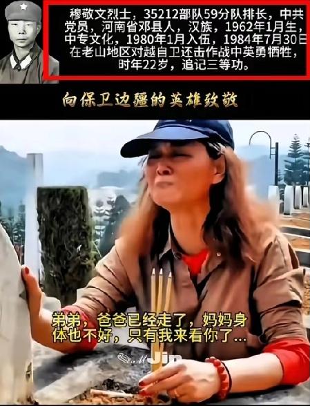 真的看不得这种画面,一看就忍不住掉眼泪。河南大姐跨越一千多公里奔赴云南麻栗坡,不是旅游探亲,只为看望长眠战场四十余年的弟弟穆敬文。 21岁本该是被家人疼爱的年纪,他却为掩护战友永远留在南疆,用青春守住家国安宁。大姐抱着墓碑撕心裂肺的呼唤,藏着全家人半生的思念,怀里护着的家乡味,是跨越生死的牵挂。 我们总觉得太平日子理所当然,却忘了是无数年轻英雄用生命挡在前面。铭记英烈不是口号,善待烈属才是最实在的致敬。