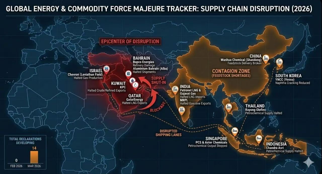 ①、卡塔尔能源公司: 3月2日暂停液化天然气工厂运营, 3月4日宣布遭遇不可抗力, 影响全球约20%的液化天然气供应。②、沙特阿美公司: 暂停拉斯塔努拉炼油厂(日处理能力55万桶)的生产, 并开始将原油发运从东部港口转向红海的延布。③、阿布扎比国家石油公司(阿联酋): 3月7日宣布, 为保持"运营灵活性", 将对海上石油产量进行控制。④、伊拉克: 南部油田产量下降70%,至每日130万桶(原为430万桶),库尔德斯坦地区多家公司暂停生产。⑤、科威特石油公司: 因无法为海运投保并履行长期合同, 宣布遭遇不可抗力。⑥、 巴林能源公司: 在锡特拉炼油厂综合体全面停工后, 宣布炼油厂遭遇不可抗力。 ⑦、埃克森美孚与道达尔能源: 正在从中东地区撤出公司员工