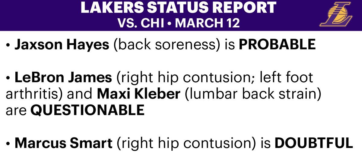 湖人更新明天比赛伤病报告:海斯(背部酸痛)大概率出战;詹姆斯(右髋挫伤、左脚关节炎)、克勒贝尔(腰背部拉伤)出战成疑;斯玛特(右髋挫伤)25%概率出战。