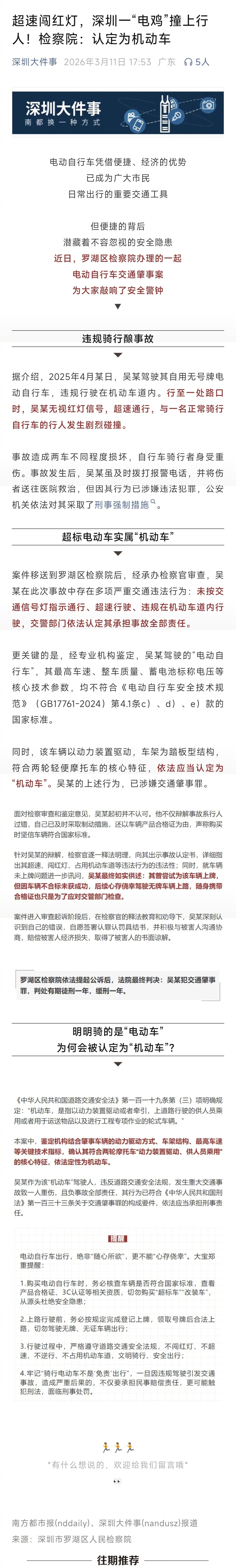 #电鸡撞伤行人车主获刑#【超速闯红灯,深圳一“电鸡”撞上行人!检察院:认定为机动车】#电鸡撞伤行人车主判一缓一#电动自行车凭借便捷、经济的优势,已成为广大市民日常出行的重要交通工具,但便捷的背后潜藏着不容忽视的安全隐患。近日,深圳市罗湖区检察院办理的一起电动自行车交通肇事案为大家敲响了安全警钟。